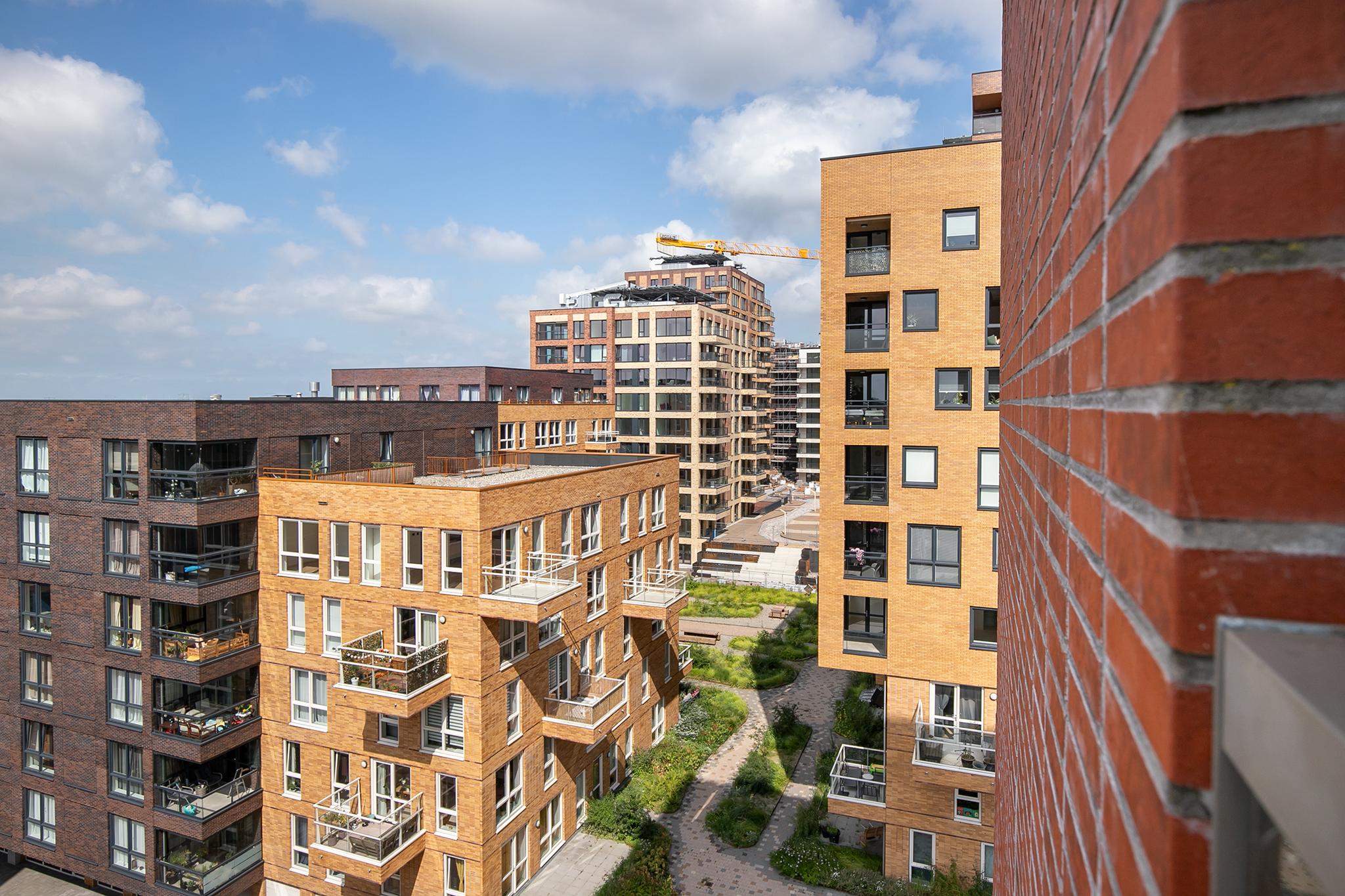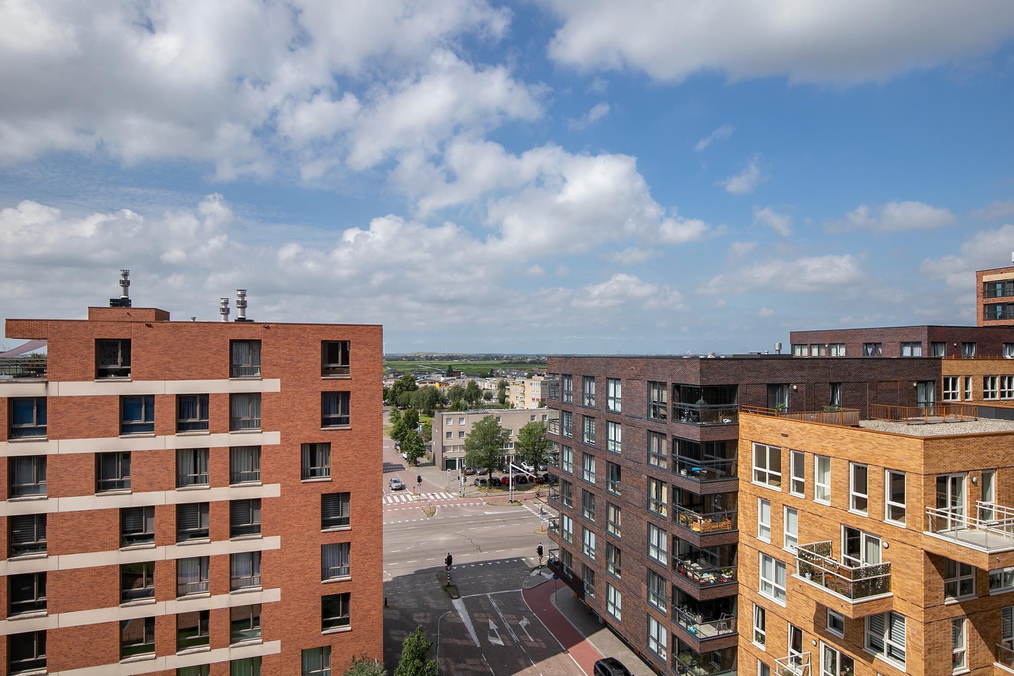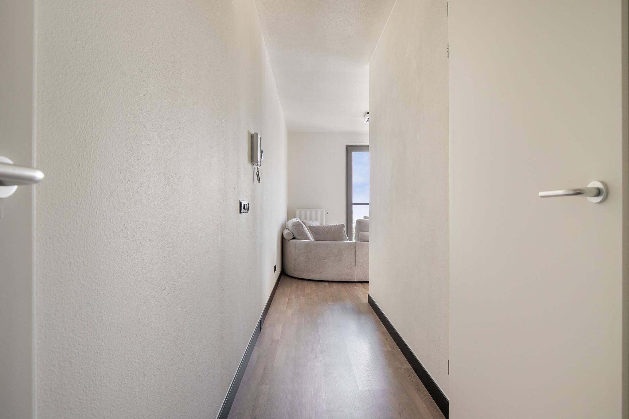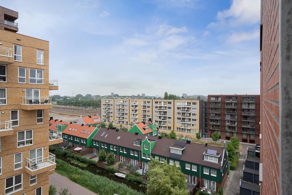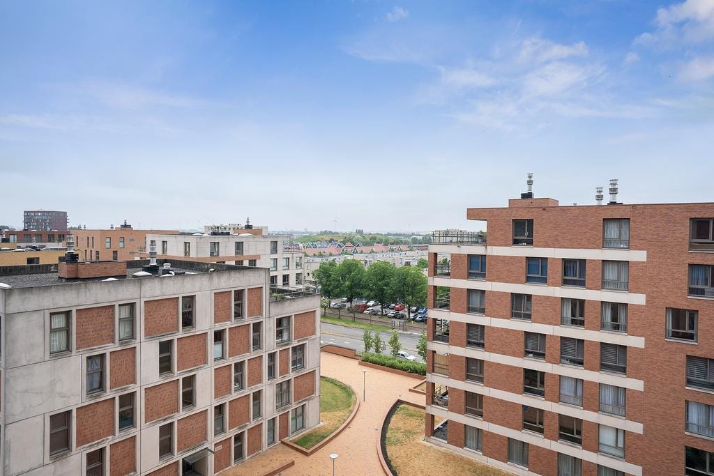 On this floor the meter cupboards are centrally placed so that space is saved for the apartment. Entrance hall with access to the bathroom with a hanging toilet, washbasin and walk-in shower, with rain shower and radiator. Second hall, technical room with central heating boiler and MV-Box, bedroom and the bright living room with modern open kitchen with various built-in appliances. The living room has two double doors with a great view over Zaandam. And there is a large shared roof terrace on the 12th floor, where you can enjoy the sun or a BBQ or a cool drink in the summer!