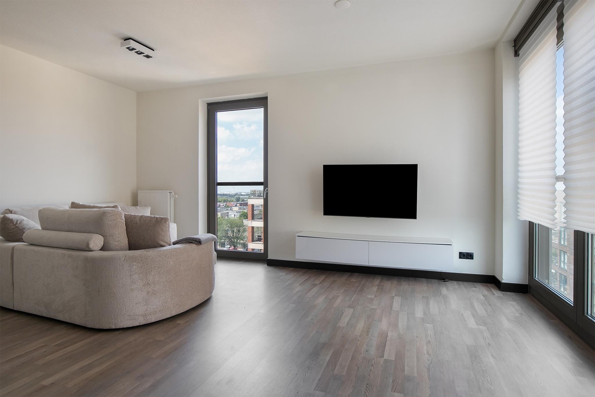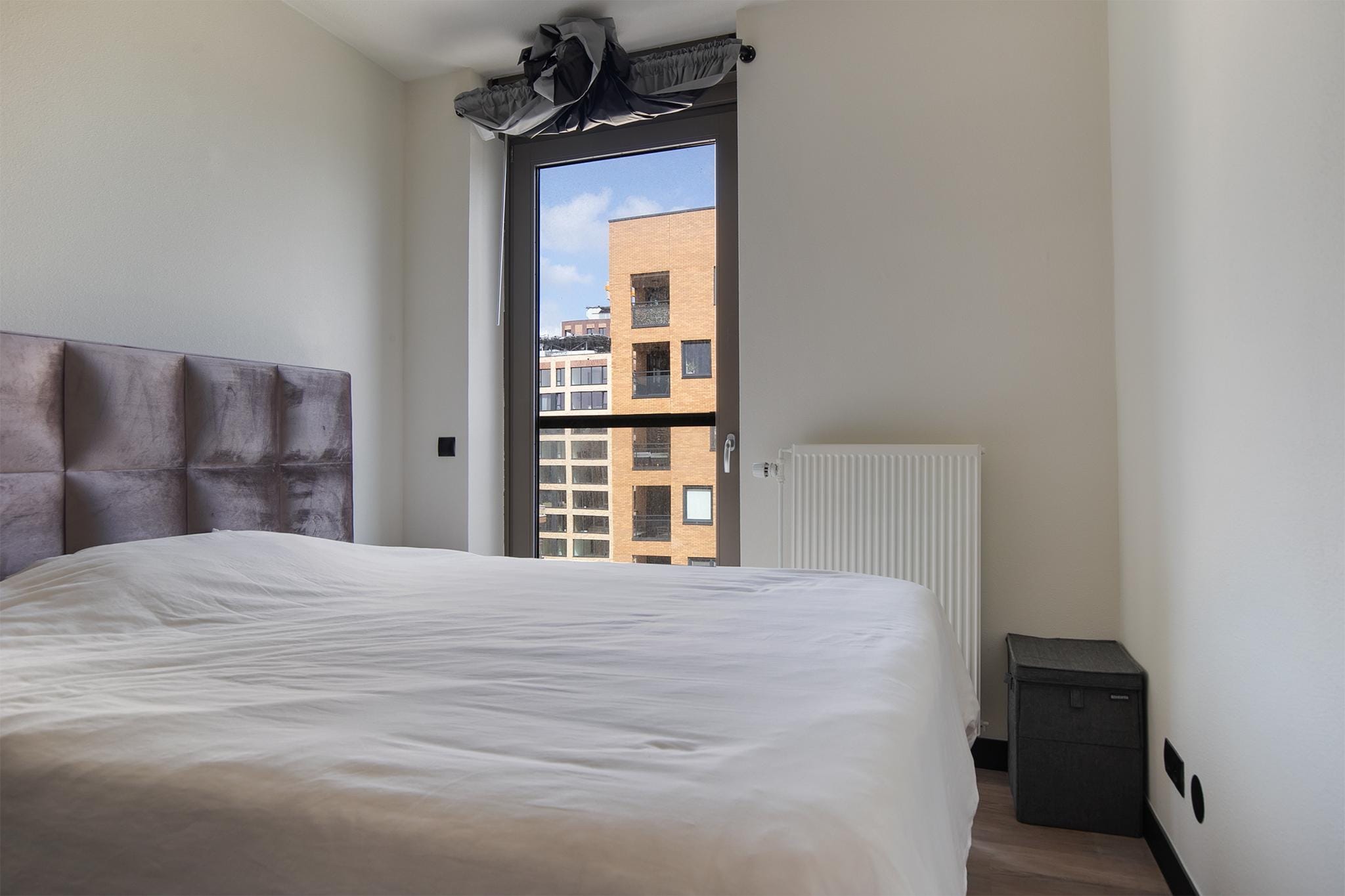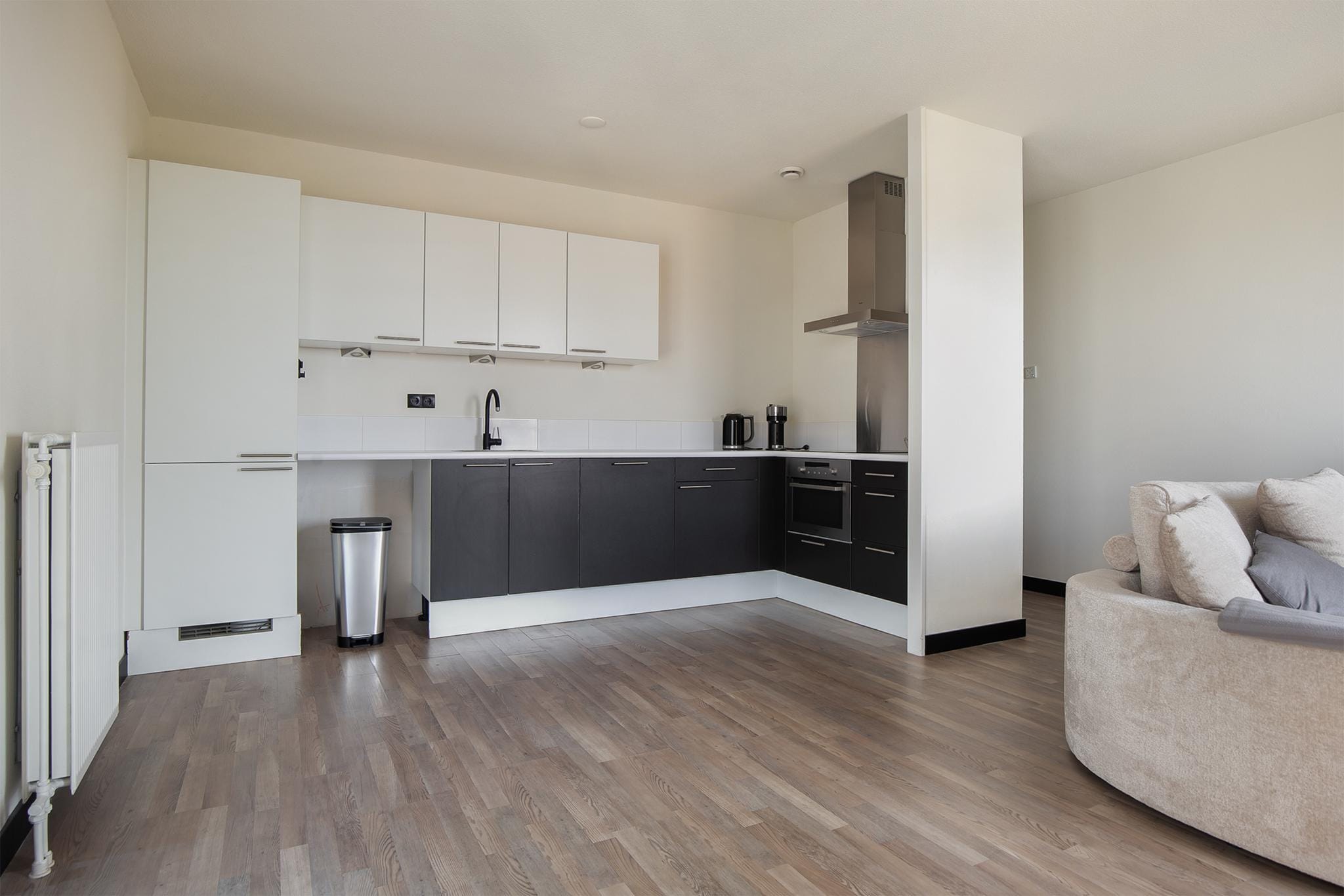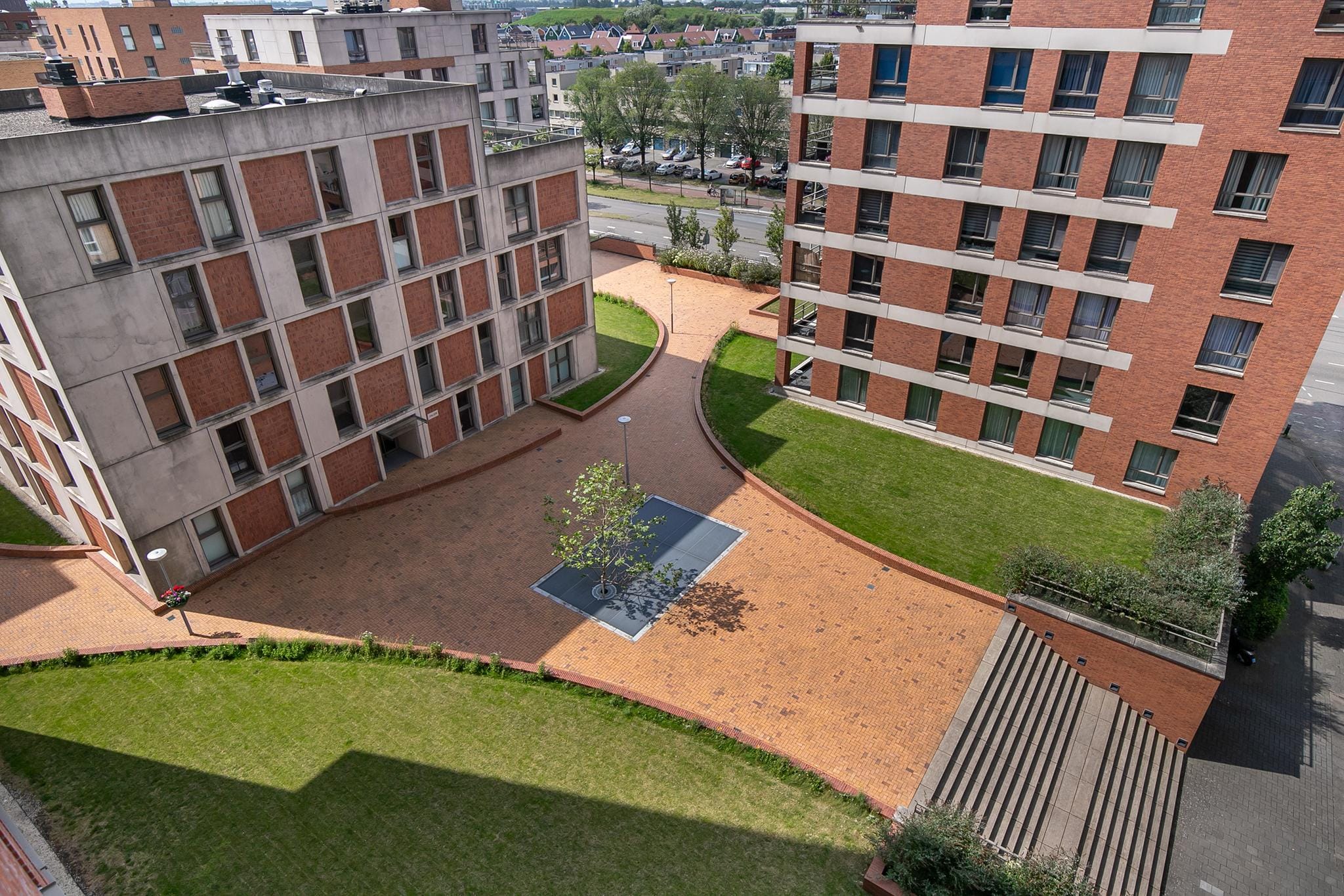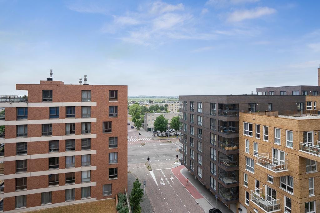 On this floor the meter cupboards are centrally placed so that space is saved for the apartment. Entrance hall with access to the bathroom with a hanging toilet, washbasin and walk-in shower, with rain shower and radiator. Second hall, technical room with central heating boiler and MV-Box, bedroom and the bright living room with modern open kitchen with various built-in appliances. The living room has two double doors with a great view over Zaandam. And there is a large shared roof terrace on the 12th floor, where you can enjoy the sun or a BBQ or a cool drink in the summer!
