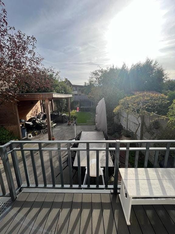 The deep garden offers an outdoor space with a dining area and a covered seating area, ideal for sunny days. In the back of the garden, you’ll find a spacious garage where you can safely park your securely park your bike(s). There are convenient side entrances on both the left and right sides of the house.