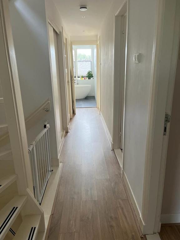 Via de trap komt u op de overloop van de eerste verdieping. Aan uw linkerzijde treft u eerst een inbouwkast met wasmachine en droger. De volgende deur leidt naar het tweede separaat toilet. Als u de gang vervolgt, bereikt u de badkamer met een groot vrijstaand ligbad, inloopdouche met regendouche en een brede wastafel met meubel. De badkamer ligt aan de tuinzijde. Slaapkamer één, is de master. Ruim en voorzien van sfeervolle spotverlichting en openslaande deuren naar het balkon. Slaapkamer twee en drie zijn eveneens ruim. Slaapkamer drie bevindt zich aan de voorzijde van de woning, maar dankzij goede isolatie is er geen geluidsoverlast door passerend verkeer. De laatste kamer op deze etage is een inloopkast.