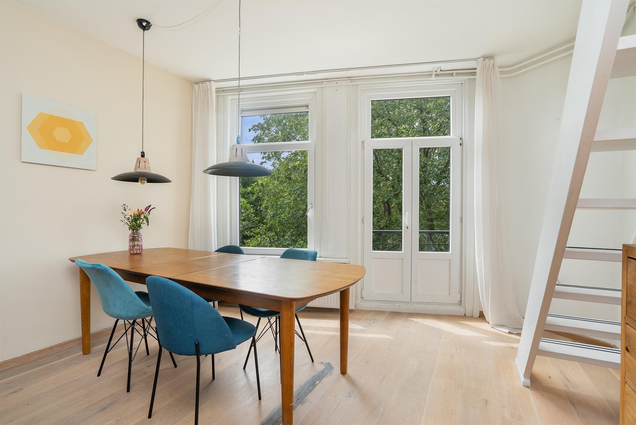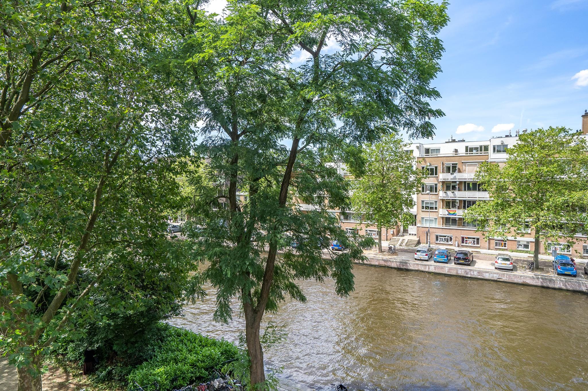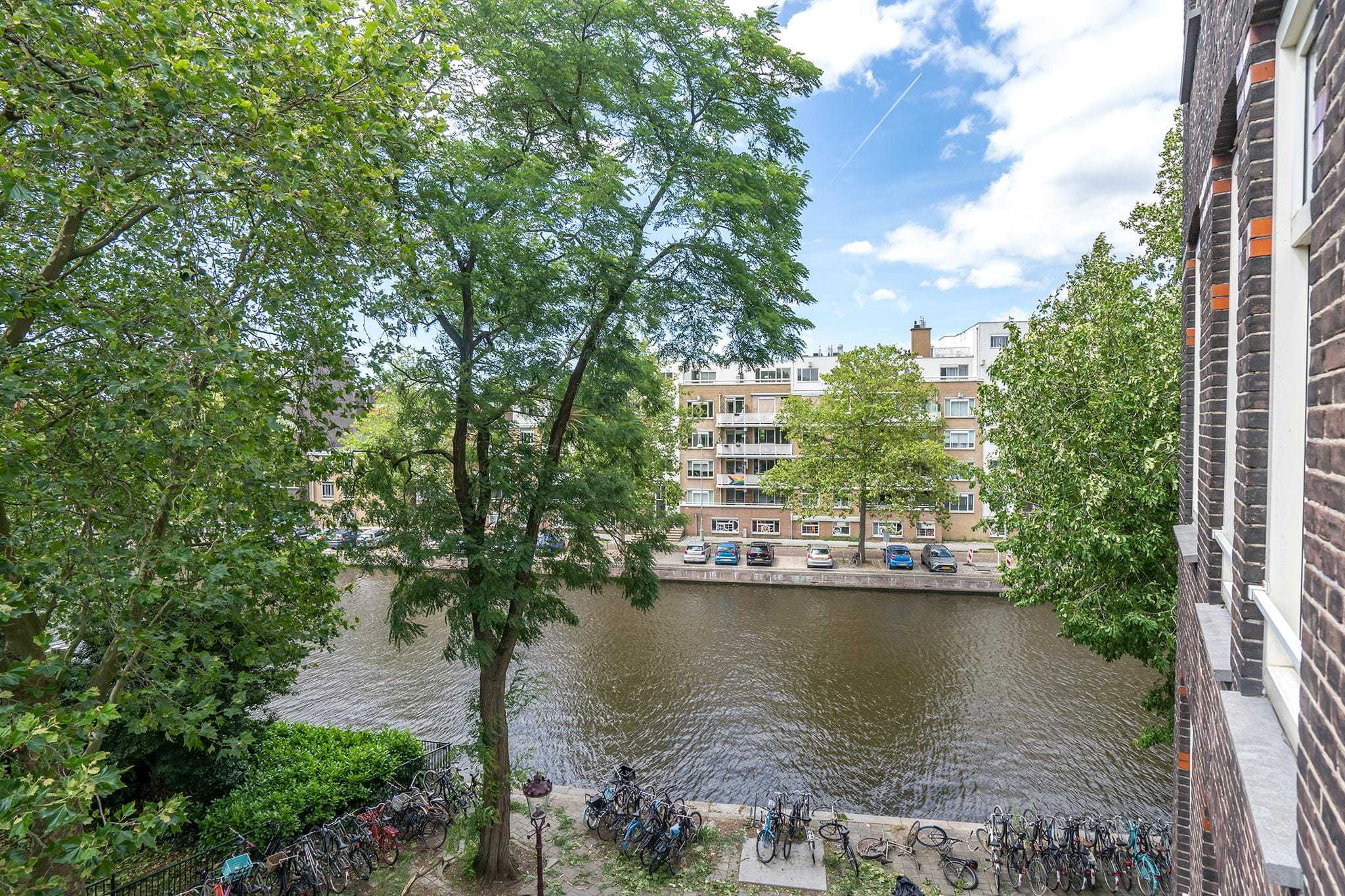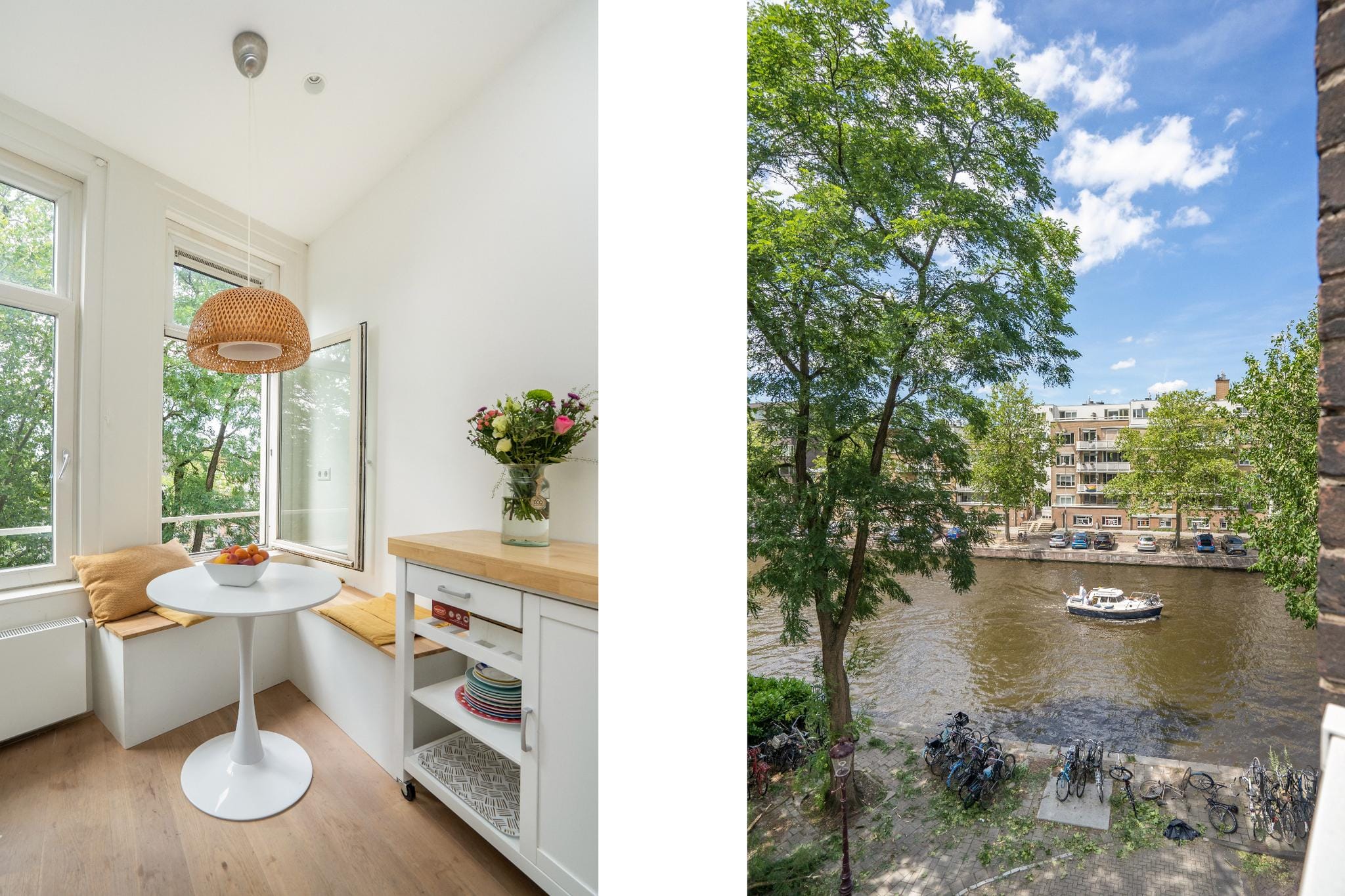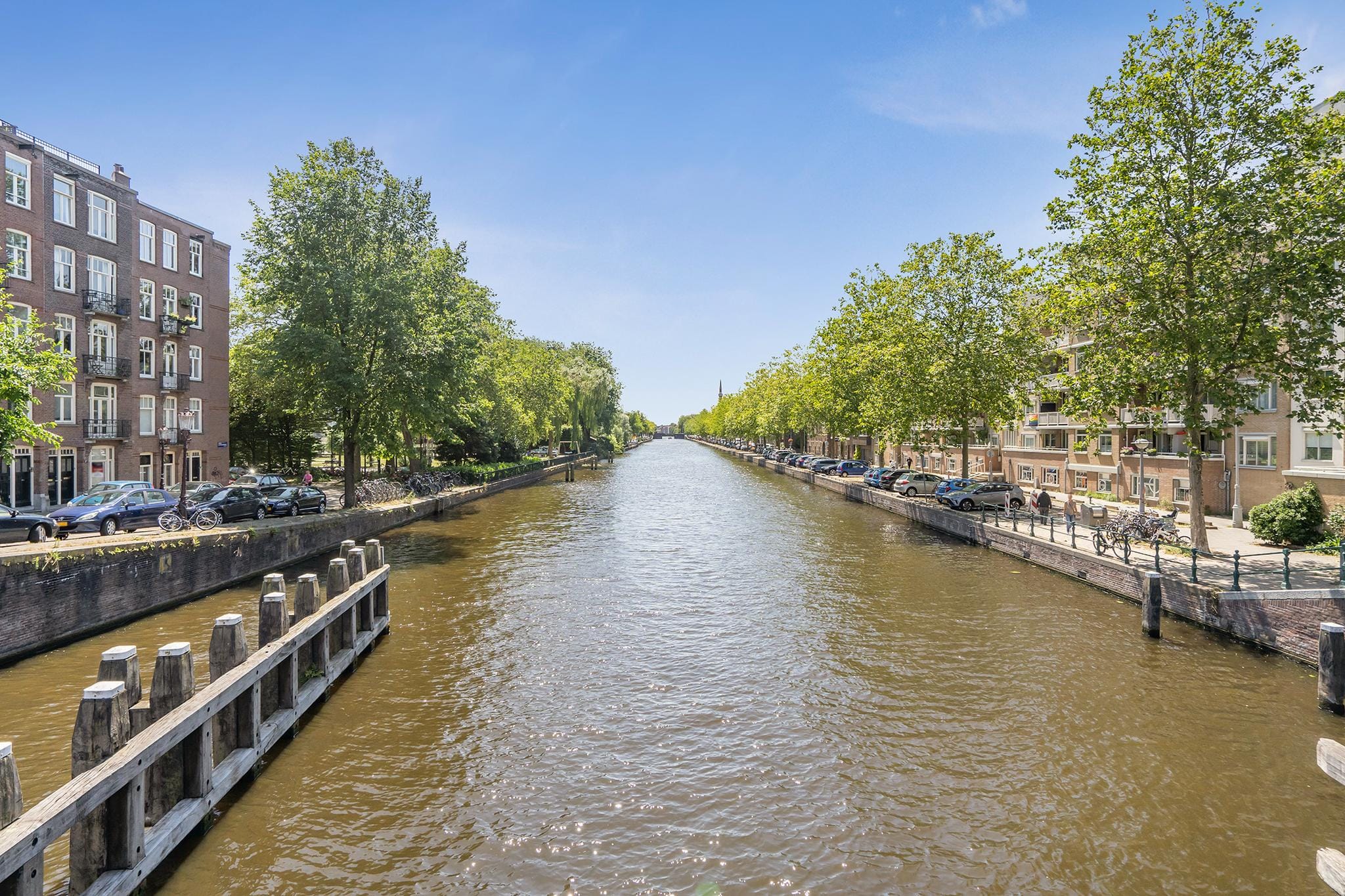 A wonderfully light corner apartment in one of the most beautiful (destination traffic only) streets of Oud West. Approximately 78 m2 of living space, unobstructed view over waterway and park from both the luxurious and cozy kitchen and from the spacious living room. Two balconies at the front and rear with beautiful views. Beautiful recently renovated bathroom, a light oak floor on both floors and two spacious and quietly located bedrooms. The light from sunrise to sunset and privacy in all rooms of this apartment, offer you a unique living comfort in the middle of the lively Old West.