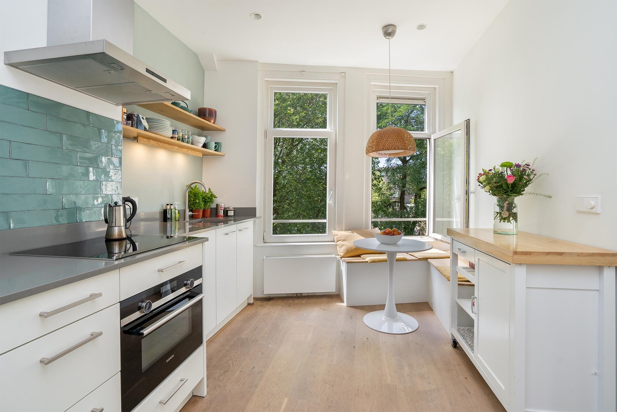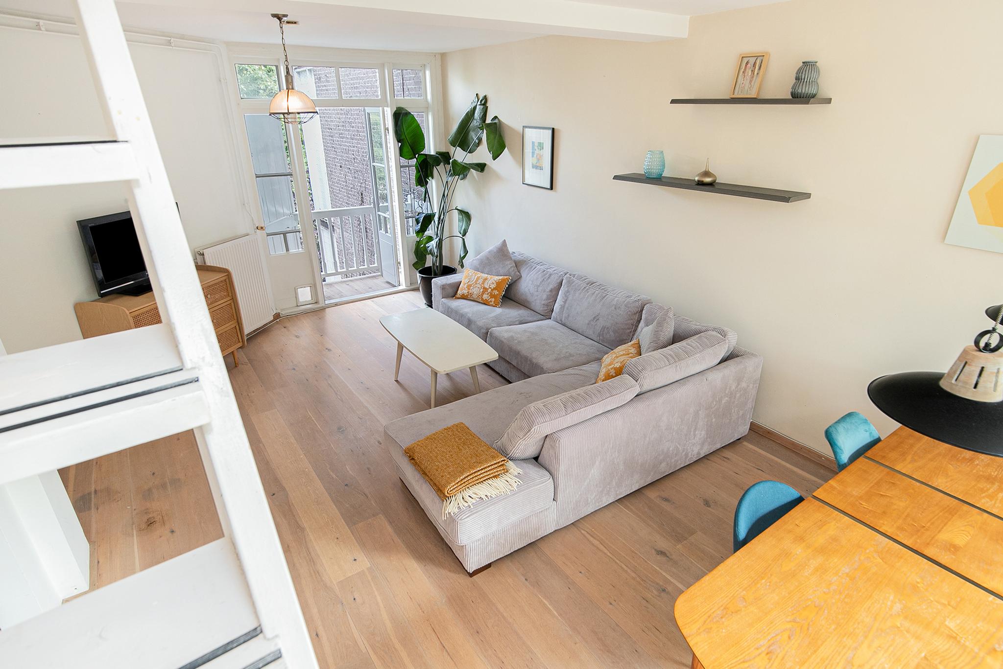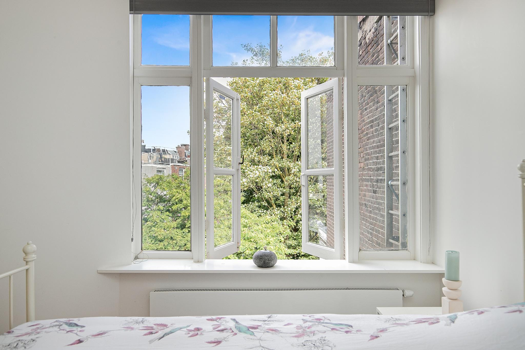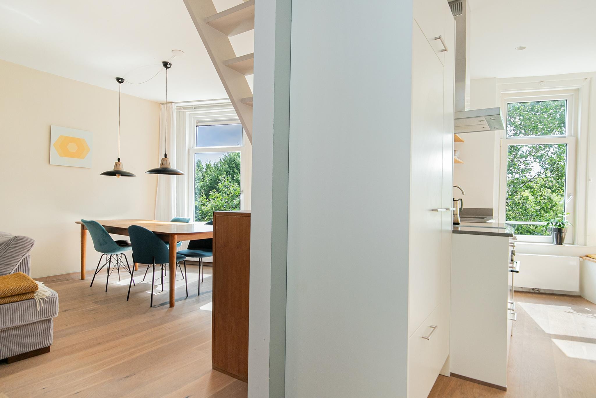 A wonderfully light corner apartment in one of the most beautiful (destination traffic only) streets of Oud West. Approximately 78 m2 of living space, unobstructed view over waterway and park from both the luxurious and cozy kitchen and from the spacious living room. Two balconies at the front and rear with beautiful views. Beautiful recently renovated bathroom, a light oak floor on both floors and two spacious and quietly located bedrooms. The light from sunrise to sunset and privacy in all rooms of this apartment, offer you a unique living comfort in the middle of the lively Old West.