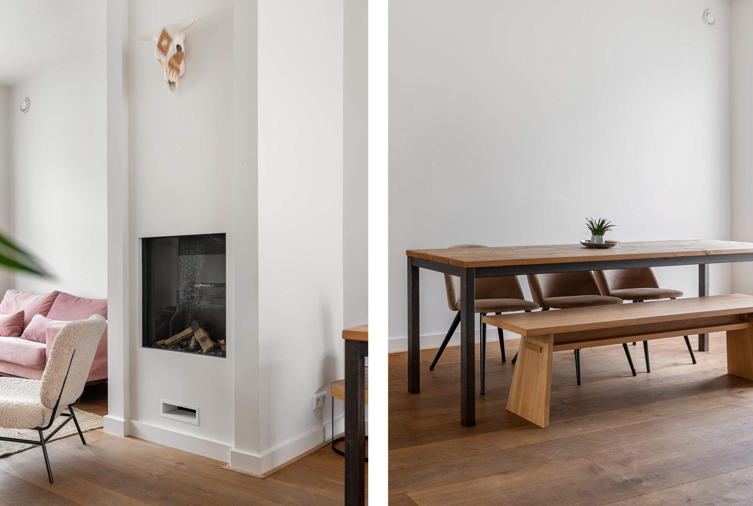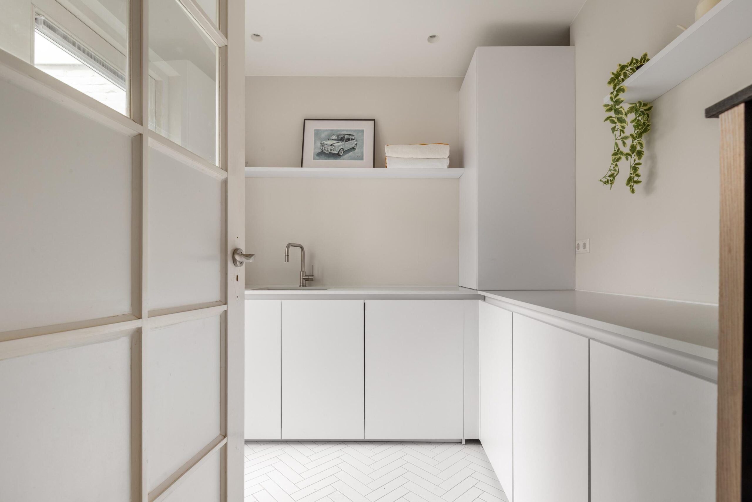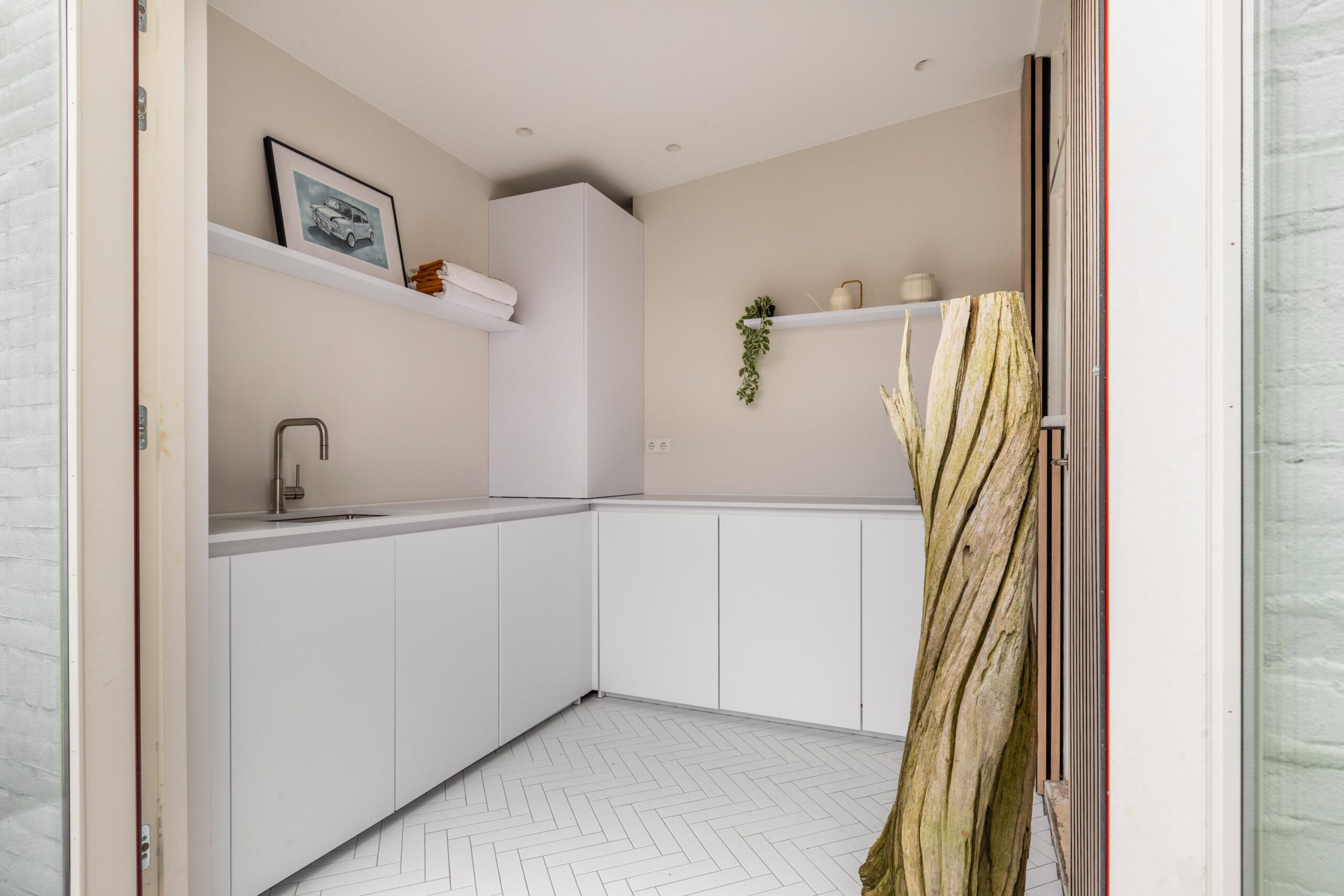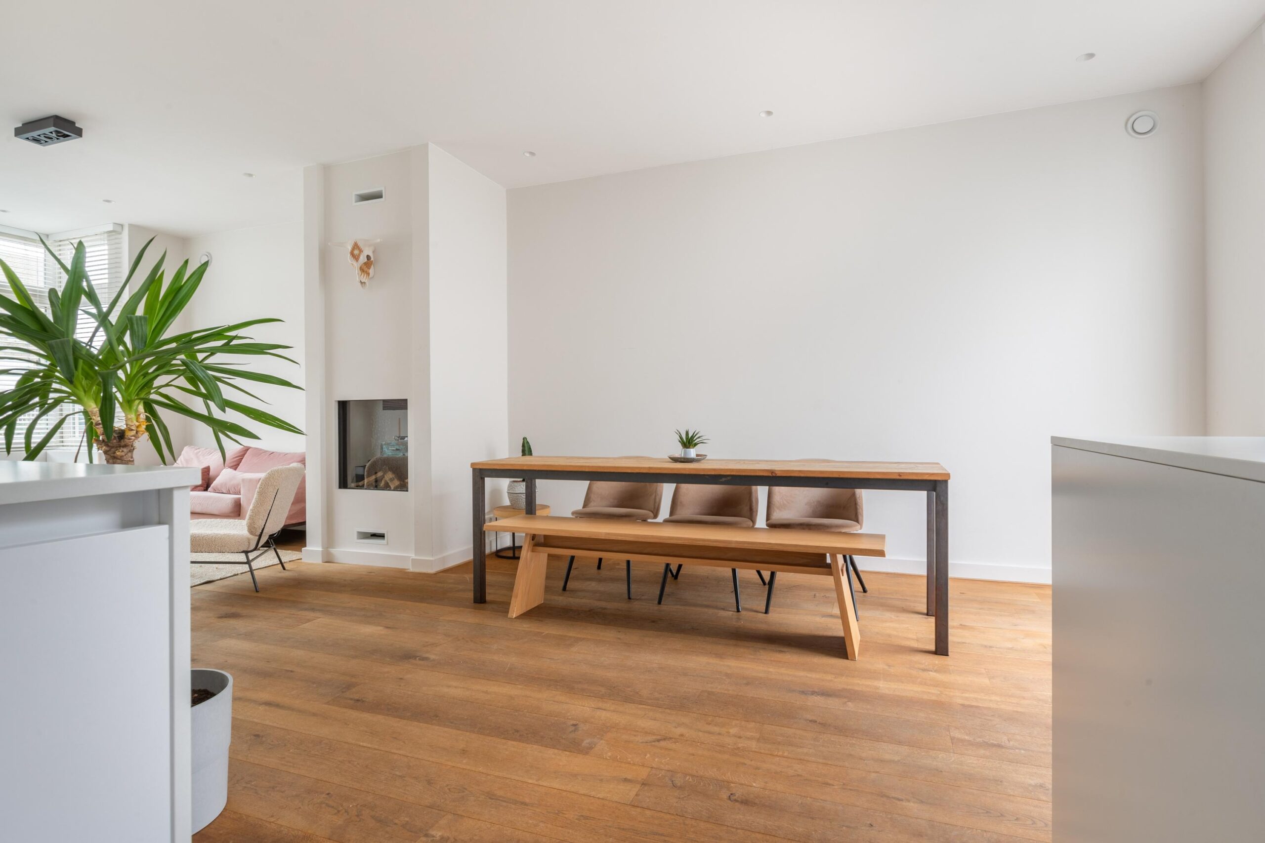 Through the entrance, you walk into the living room with a gas fireplace. This is directly connected to the open kitchen, which is equipped with all conveniences. The kitchen has a hot water tap, a dishwasher, refrigerator, freezer, and more than enough cabinet space. Adjacent to this kitchen is also a spacious utility room, in the same contemporary style as the kitchen.