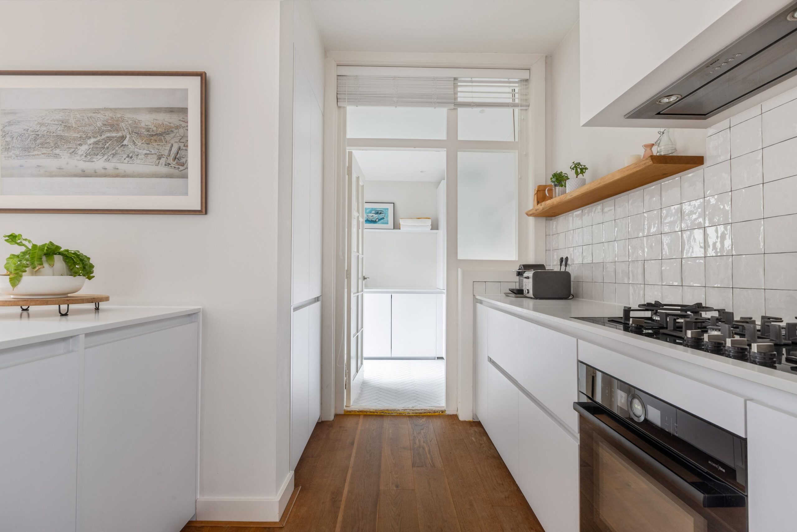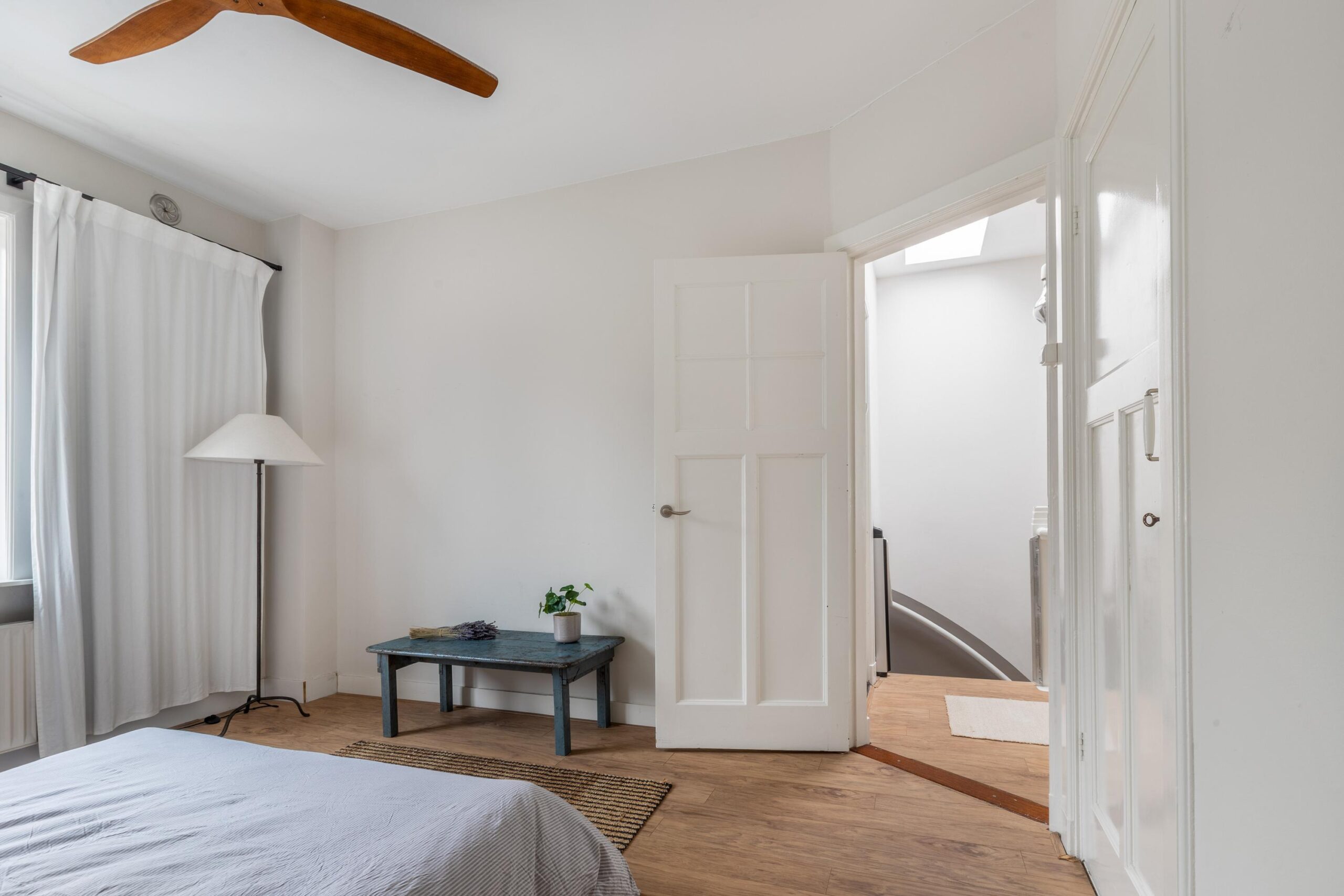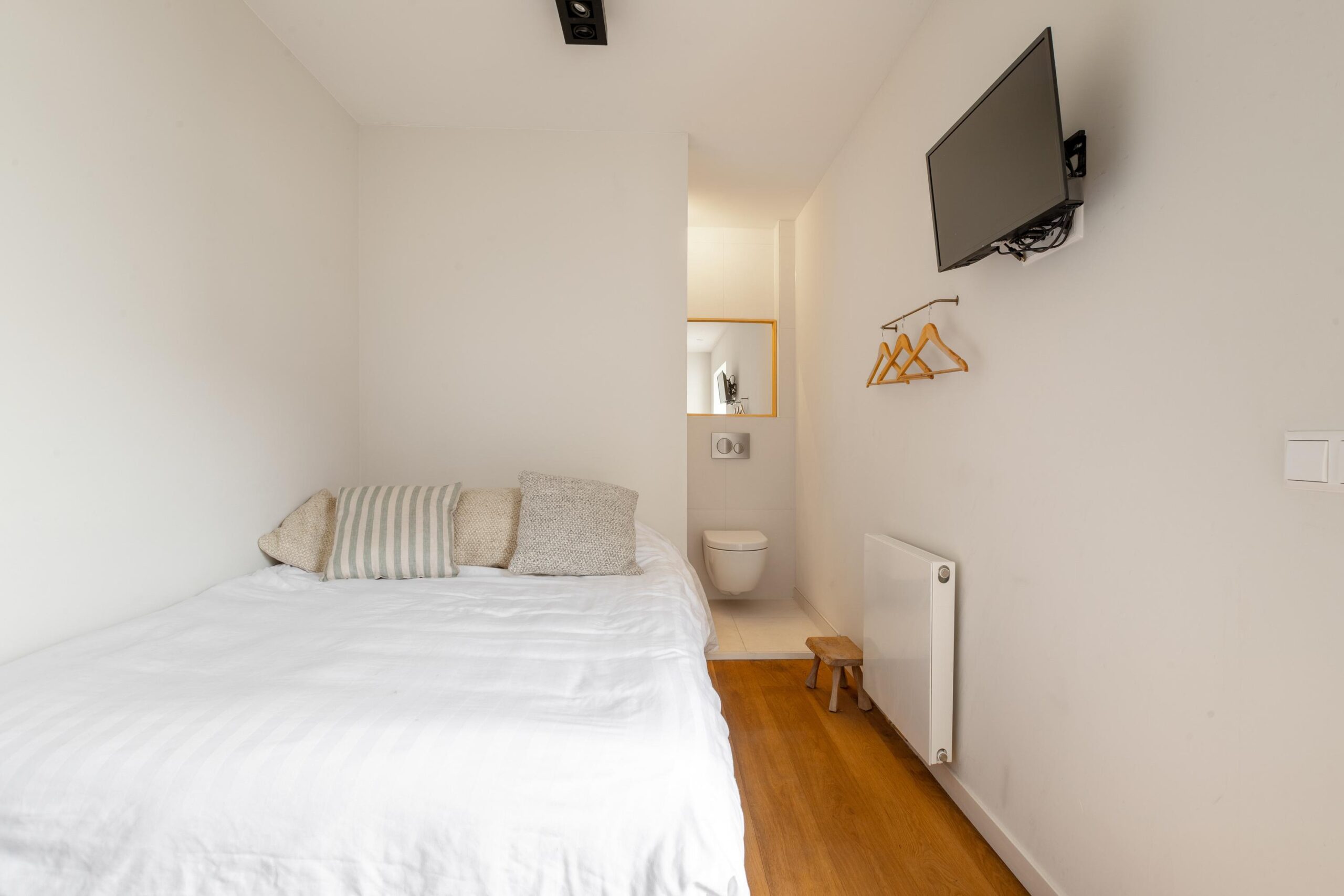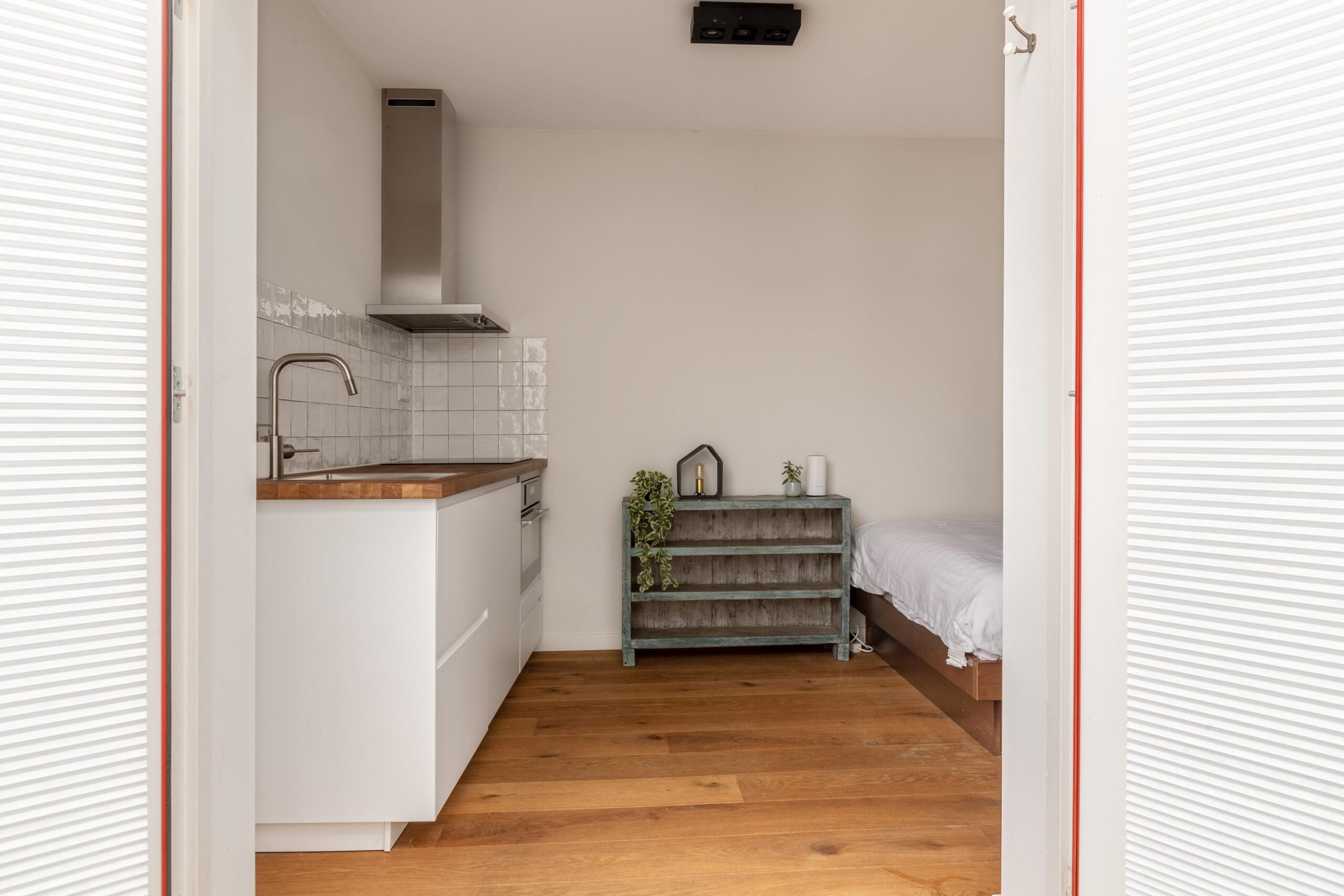 Through the double French doors, you walk into the sunny backyard, where you can also easily enter the guesthouse. This room has everything you need to rent it out, but also to provide guests with private accommodation. By everything, we really mean that everything is present. A private kitchen with cooking facilities, space for a large double bed, and also a private bathroom with rain shower and toilet. The garden also has a spacious storage shed, with a separate entrance from the street side, so that guests of the guesthouse do not have to pass through the house.
