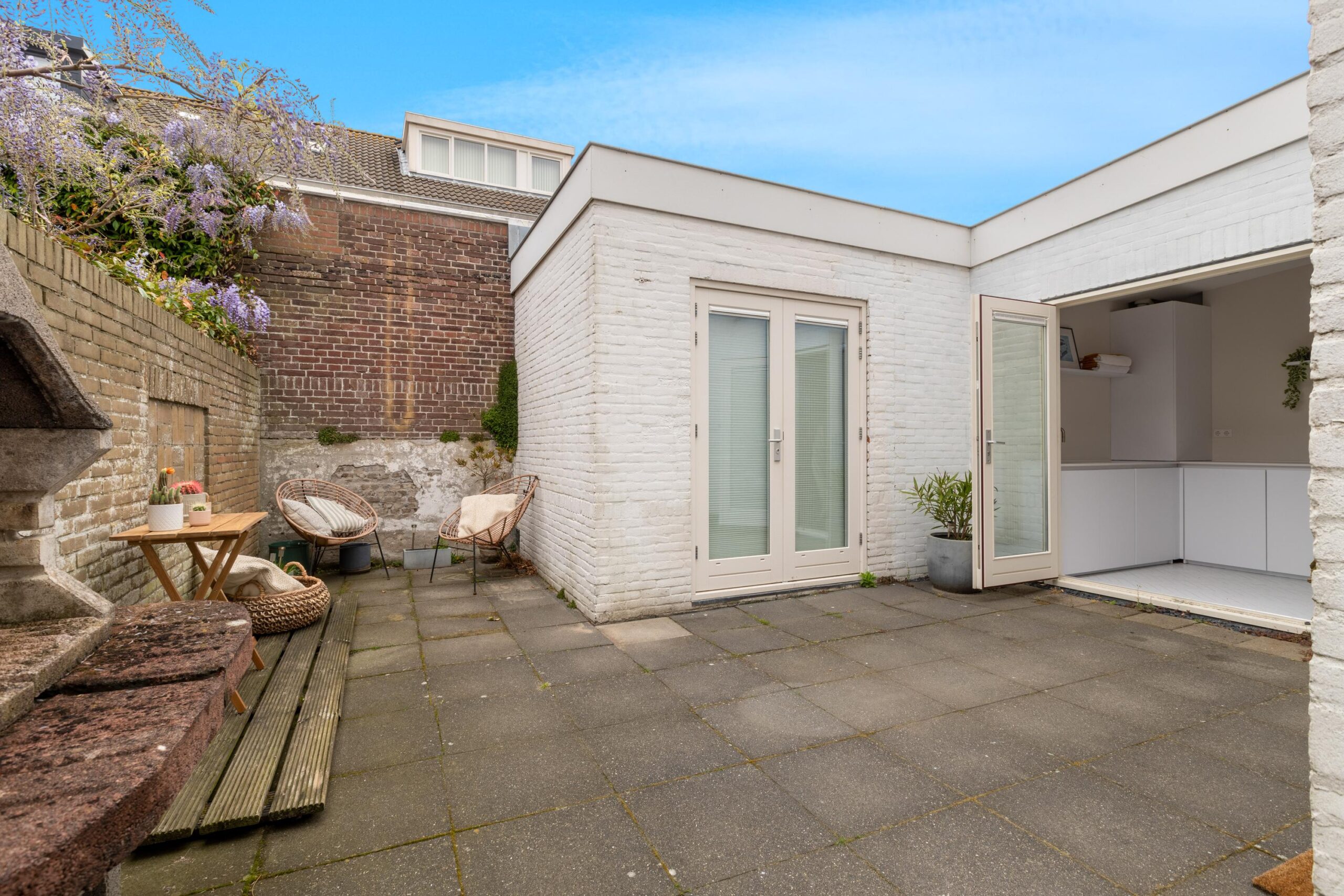 Through the double doors you walk into the sunny backyard, where you also walk into the guest house. This room has everything you need to rent it out, but also to offer guests private accommodation. When we say everything, we really mean everything is there. A private kitchen with cooking facilities, space for a spacious double bed and also a private bathroom with rain shower and toilet. The garden also has a spacious storage room, with a separate entrance from the street side, so that guests of the guesthouse do not have to go through the house.