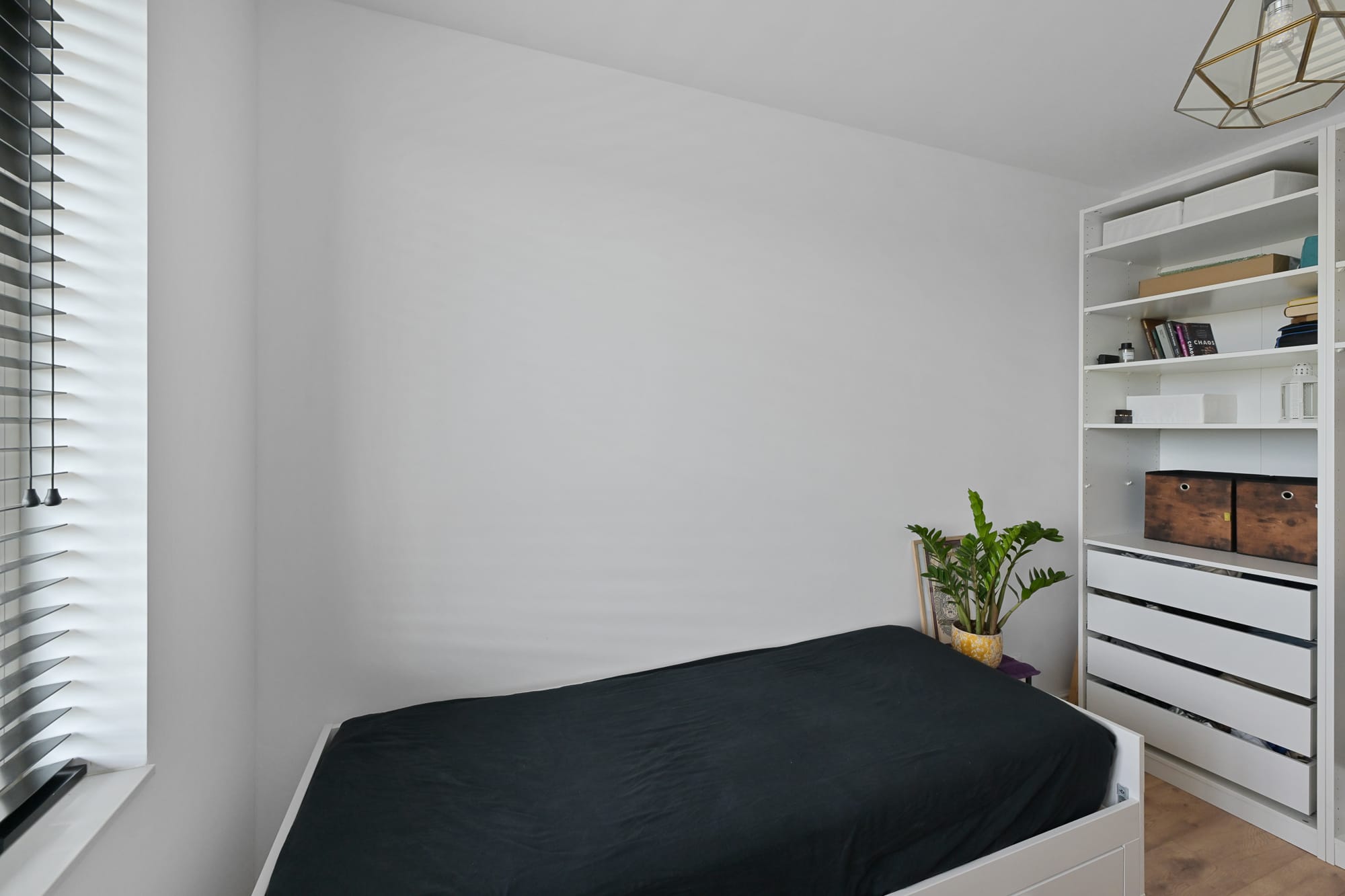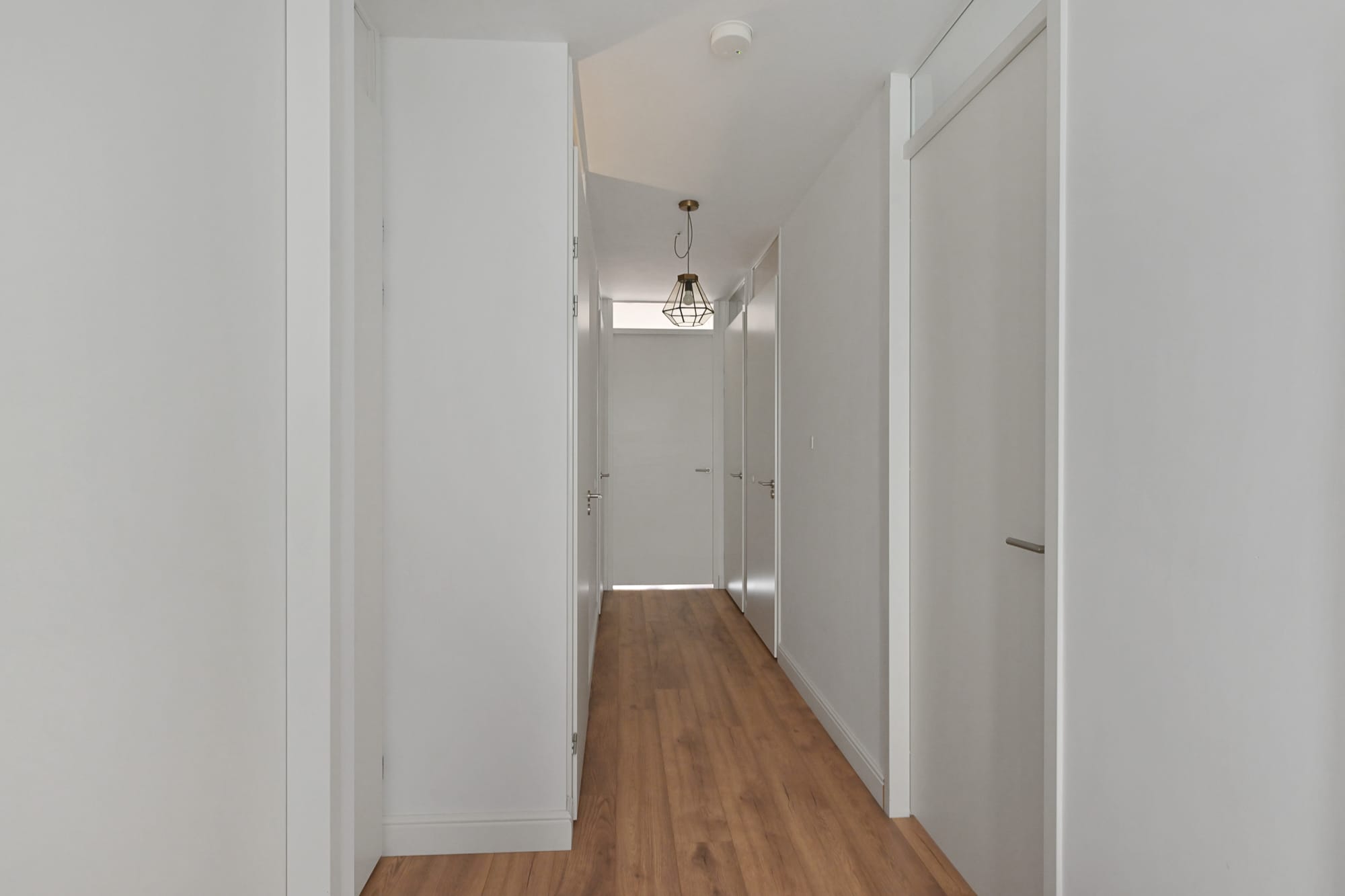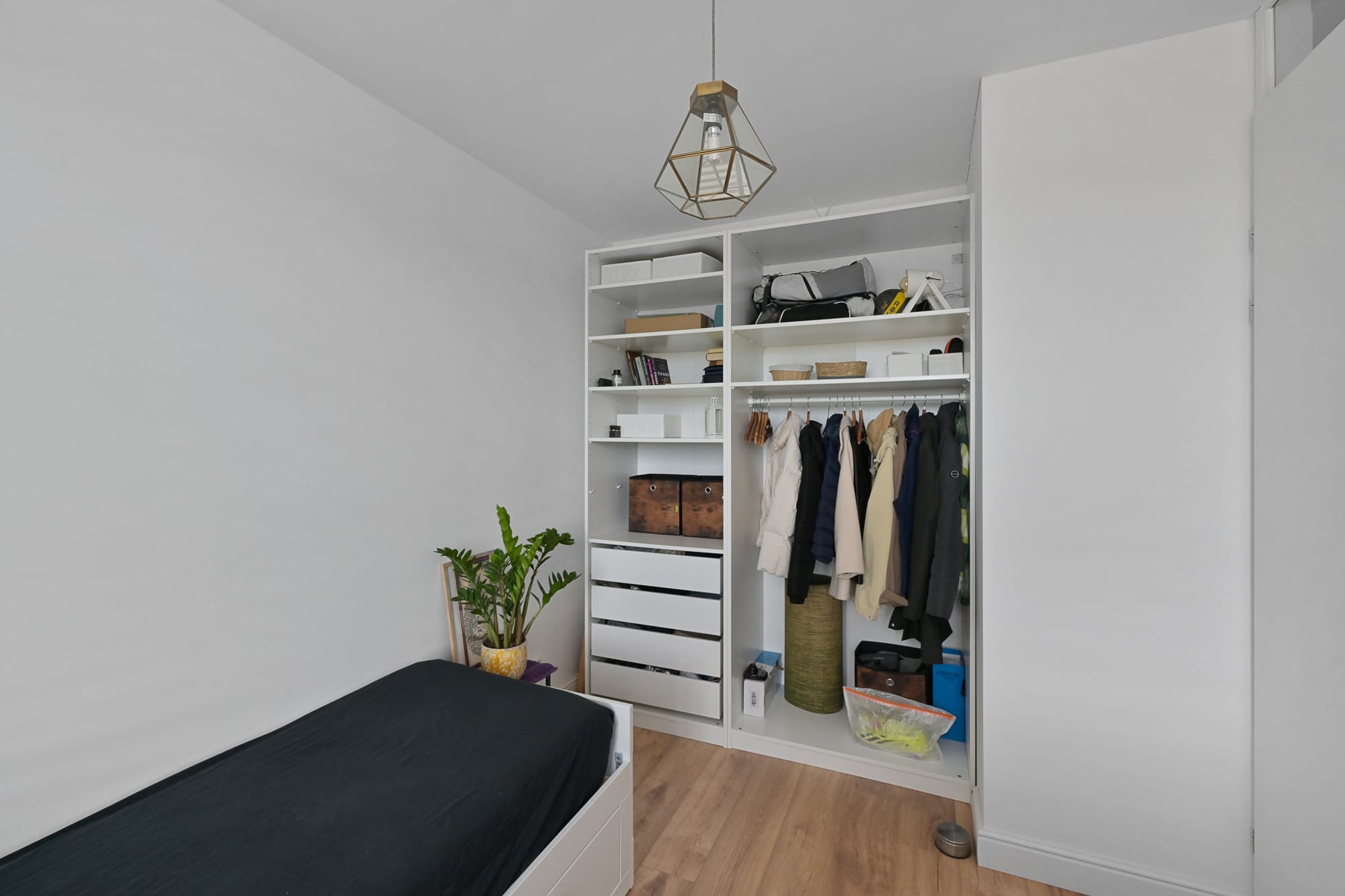 Via de centrale hal met intercomsysteem brengt de lift of de trap je naar de vijfde verdieping. Bij binnenkomst in het appartement betreed je de lange hal met aan weerszijden slaapkamers. De slaapkamer aan de rechterkant is het grootst en heeft ruimte voor een tweepersoonsbed, veel kastenruimte en beide slaapkamers hebben uitzicht op de achterzijde van het complex.