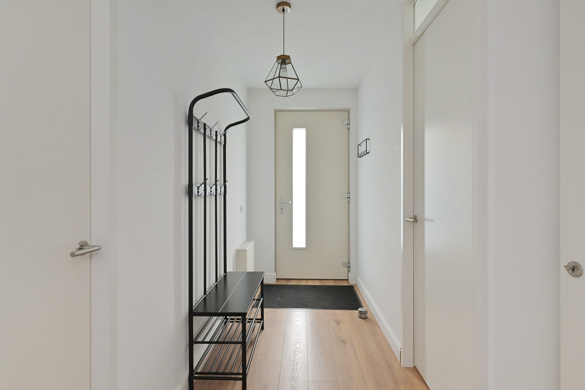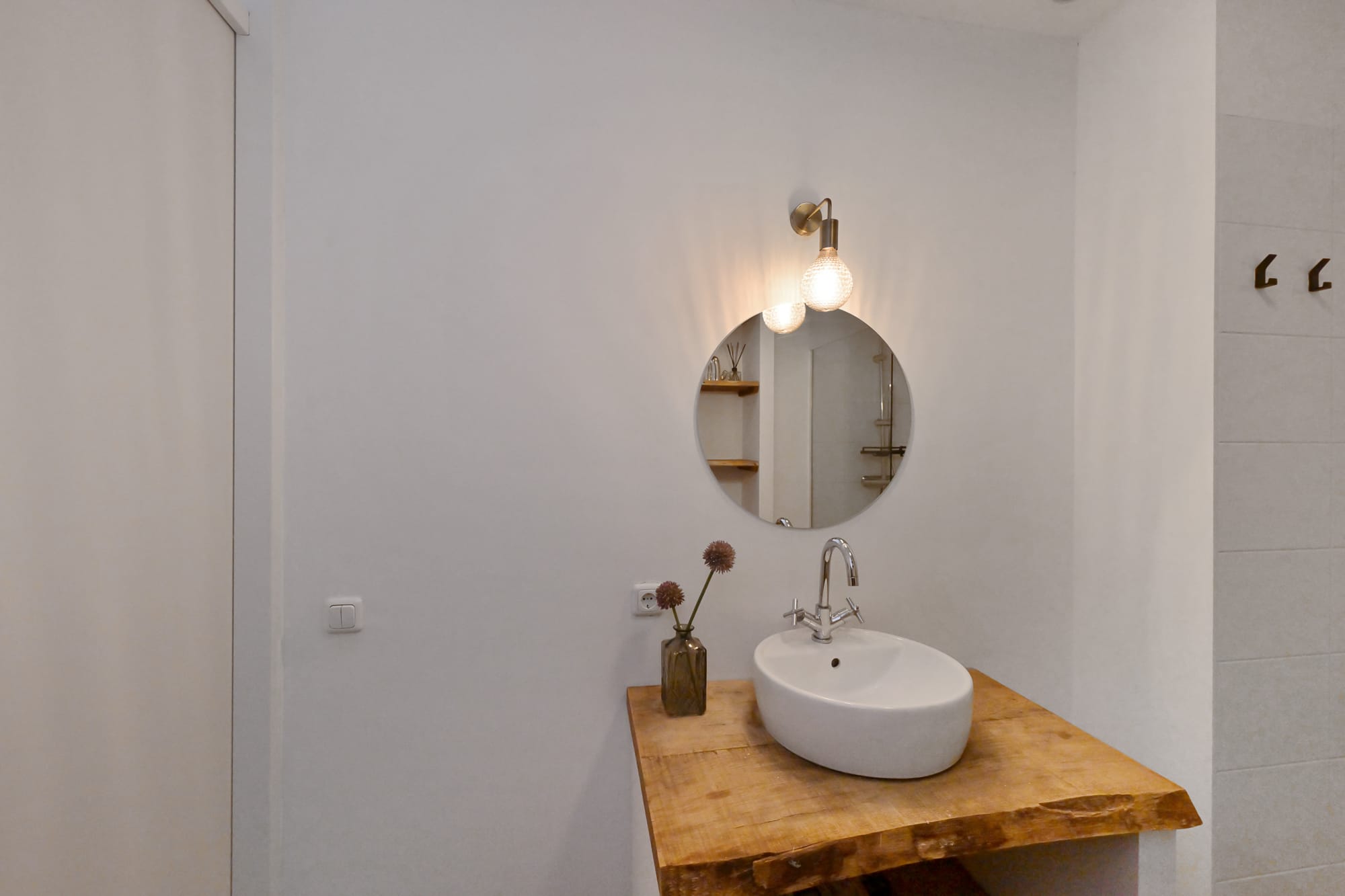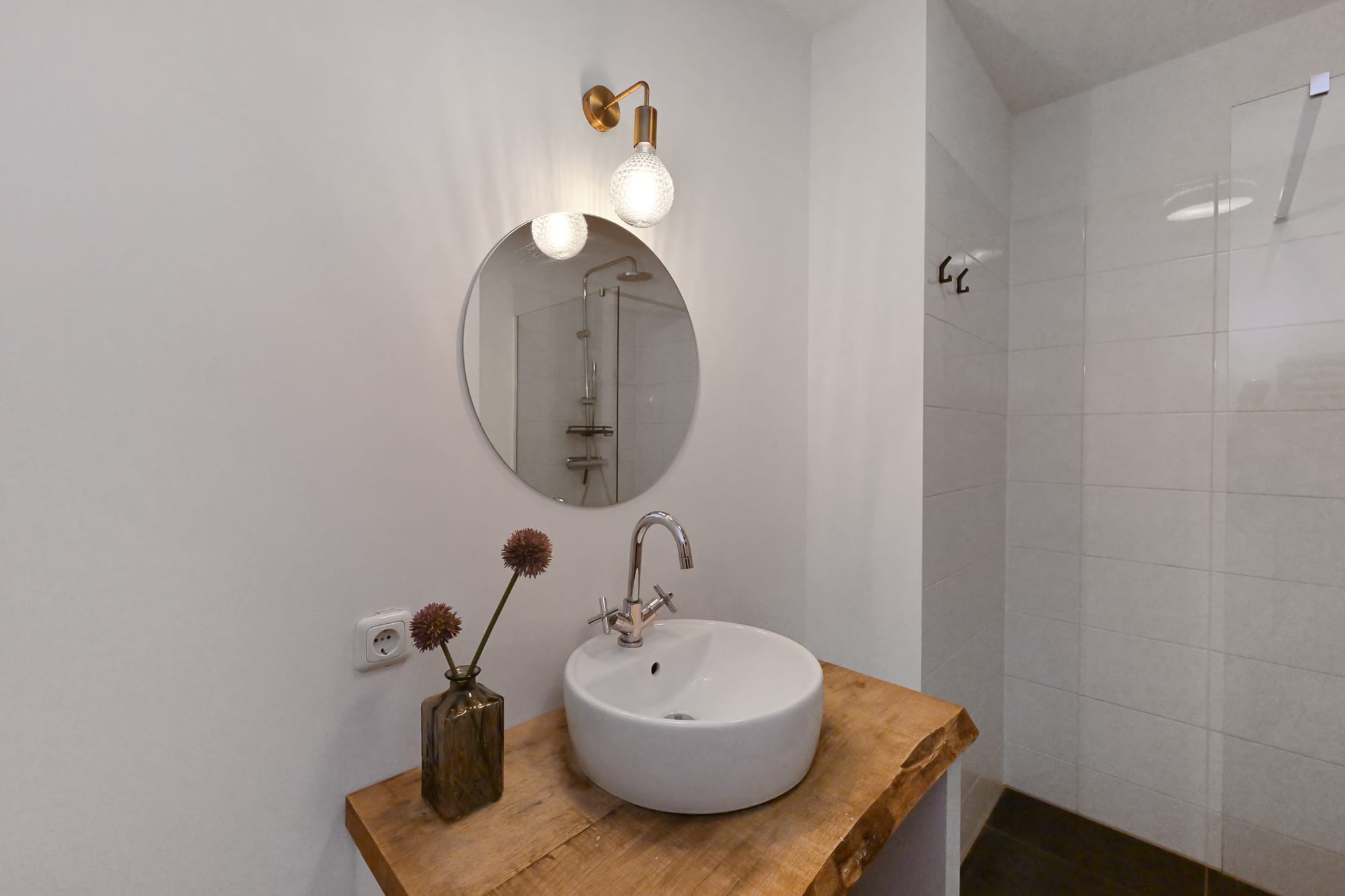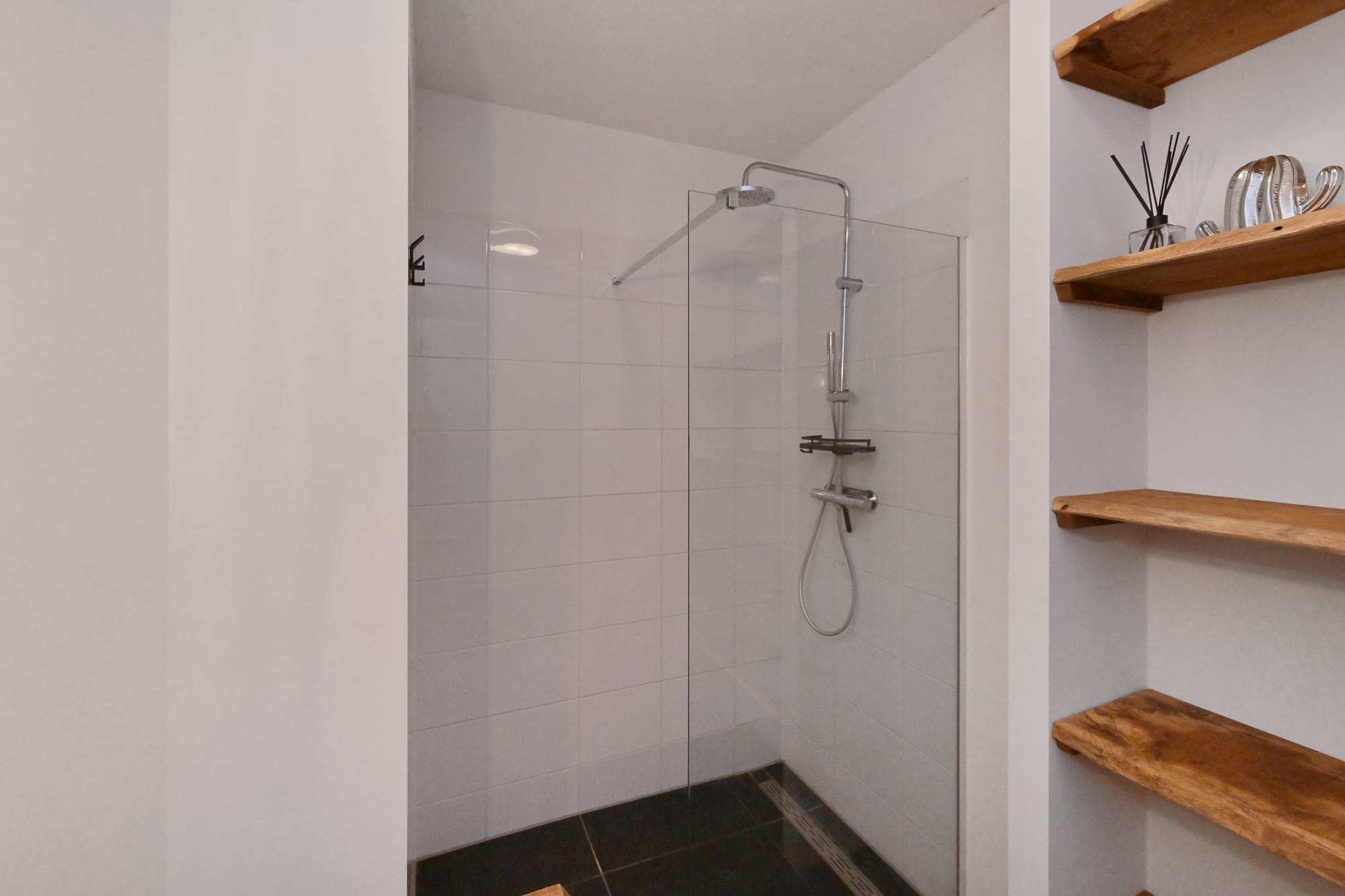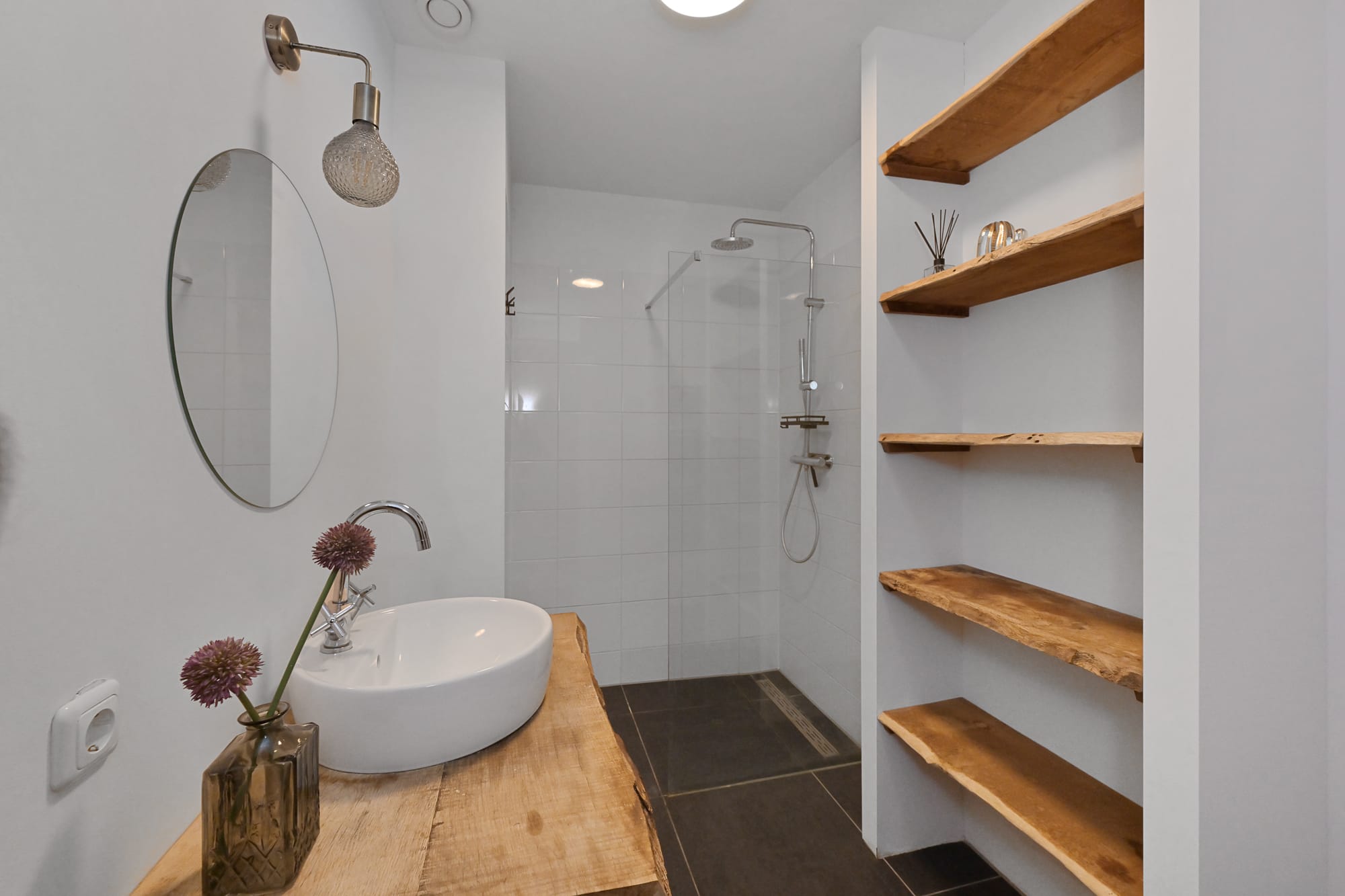 On the left side of the hall is the meter cupboard, the very neatly finished separate toilet and a storage room with the central heating and connection for the washing machine. On the right side of the hall you will find the spacious bathroom, which, like the freestanding toilet, is neatly and modernly furnished. The wooden planks on the wall and at the sink give this space a natural and peaceful appearance. The walk-in and rain shower complete this space. At the end of the hall, on the right side, there is even a second storage room. With a length of 3 meters, it is ideal to use as a pantry. Items that you often use, but prefer not to have in sight, can easily be stored here.