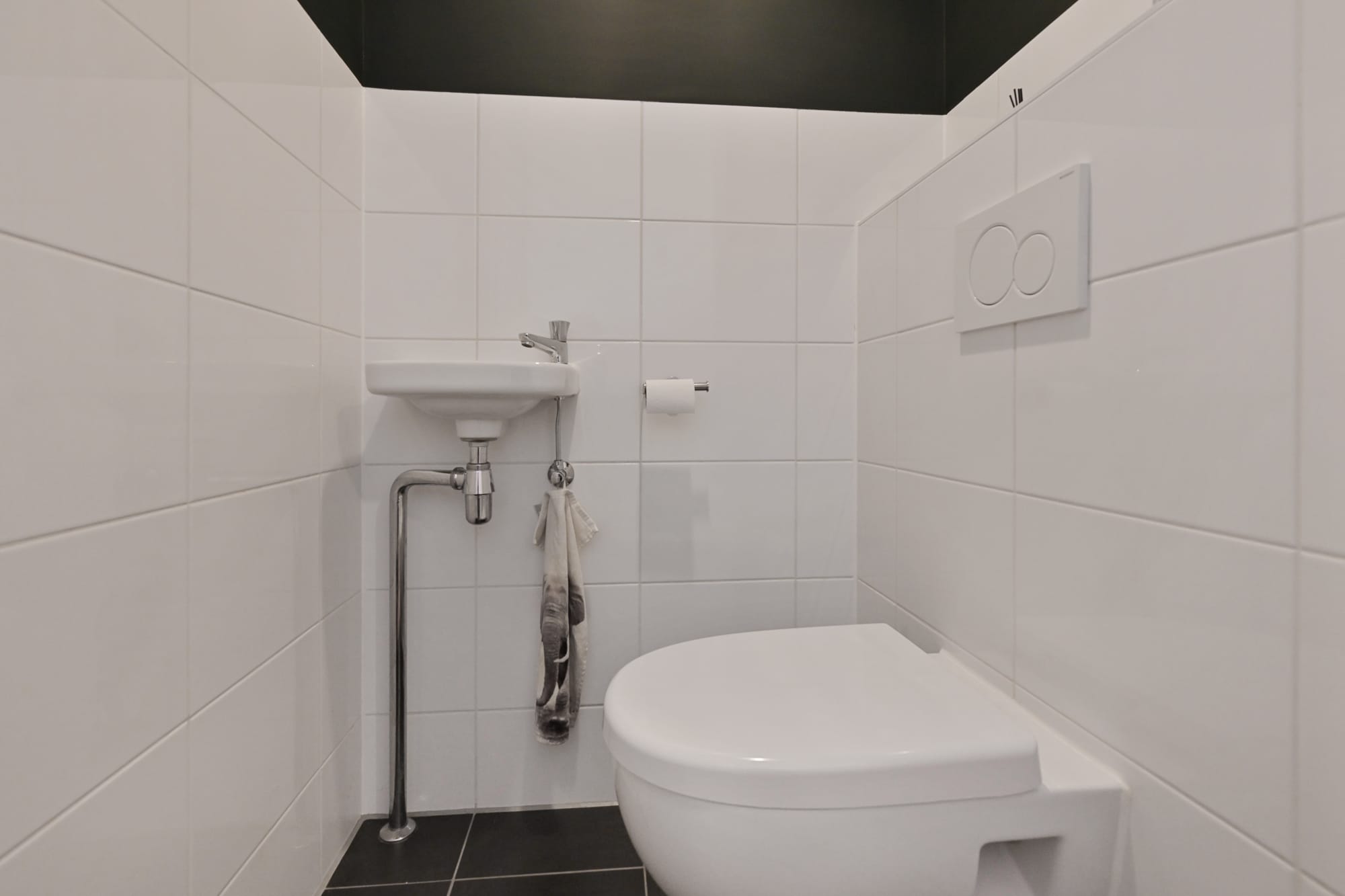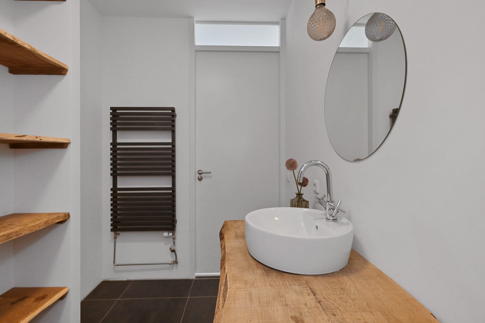 Aan de linkerzijde van de hal bevindt zich de meterkast, het zeer net afgewerkte aparte toilet en een berging waar de CV en aansluiting voor de wasmachine. Aan de rechterzijde van de hal vind je de ruime badkamer, die net als het vrijstaande toilet netjes en modern is ingericht. De houten planken aan de wand en bij de wastafel geven deze ruimte en natuurlijke en rustige uitstraling. De inloop- en regendouche maken deze ruimte helemaal af. Aan het eind van de hal is aan de rechterzijde zelfs nog een tweede berging. Met een lengte van 3 meter is deze ideaal te gebruiken als voorraadkast. Spullen die je vaak gebruikt, maar liever niet in het zicht hebt, kun je hier met gemak kwijt.