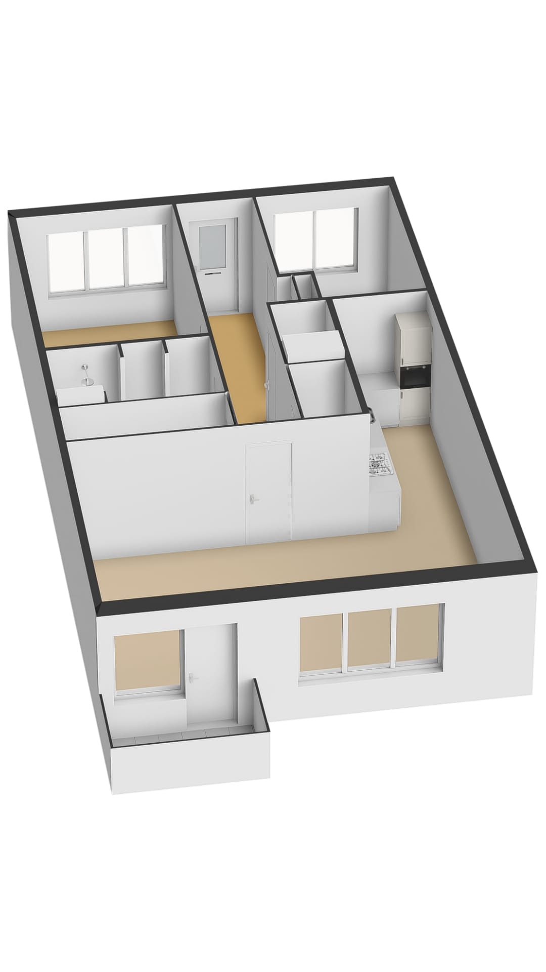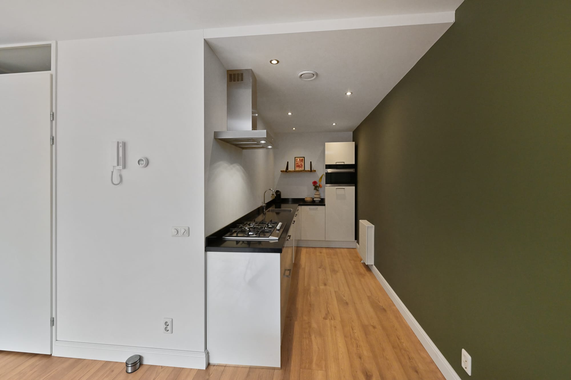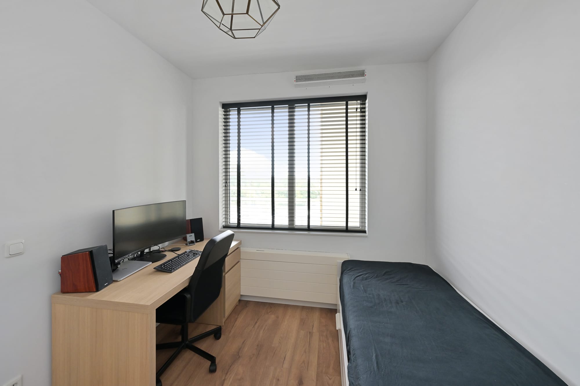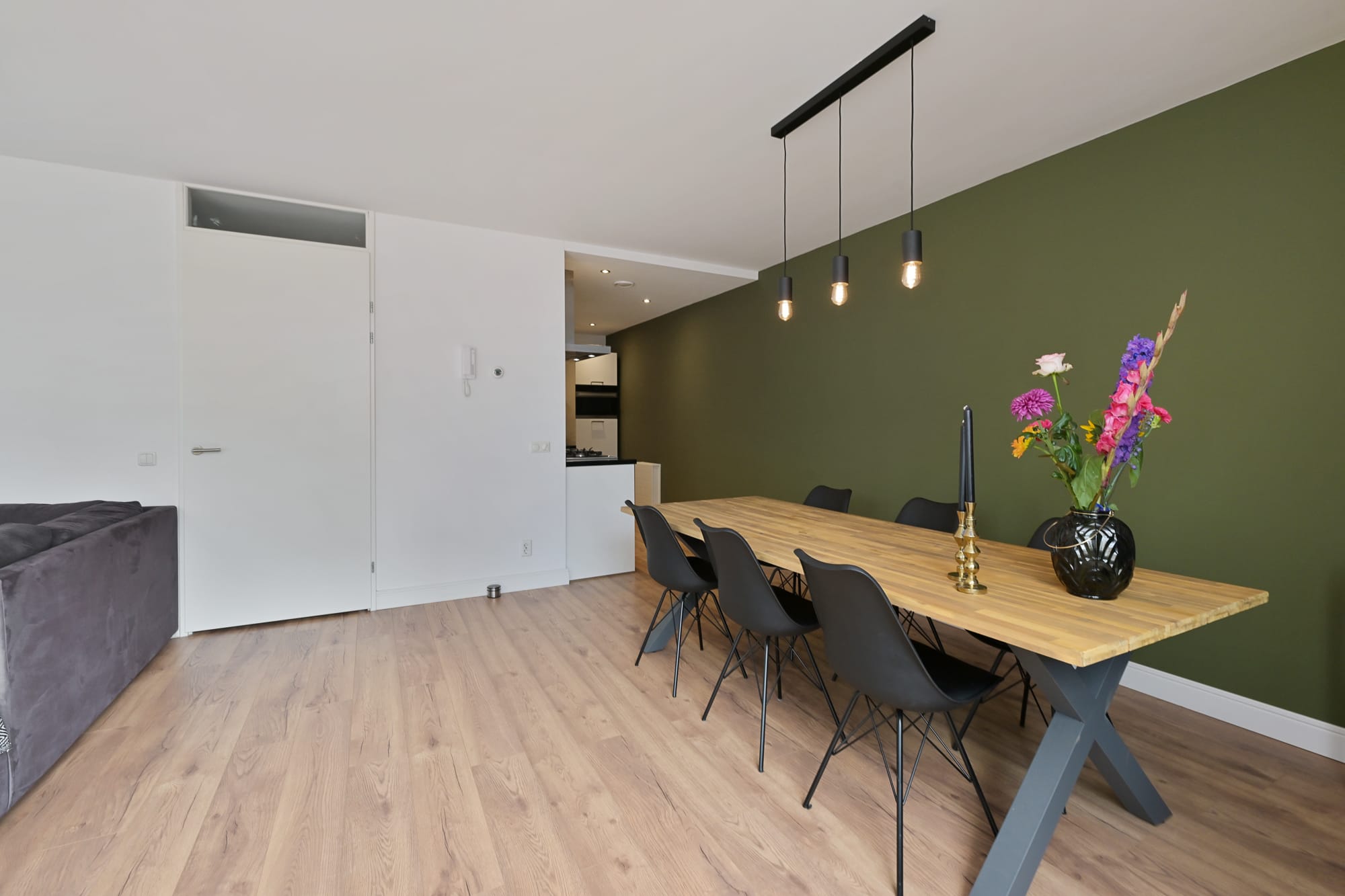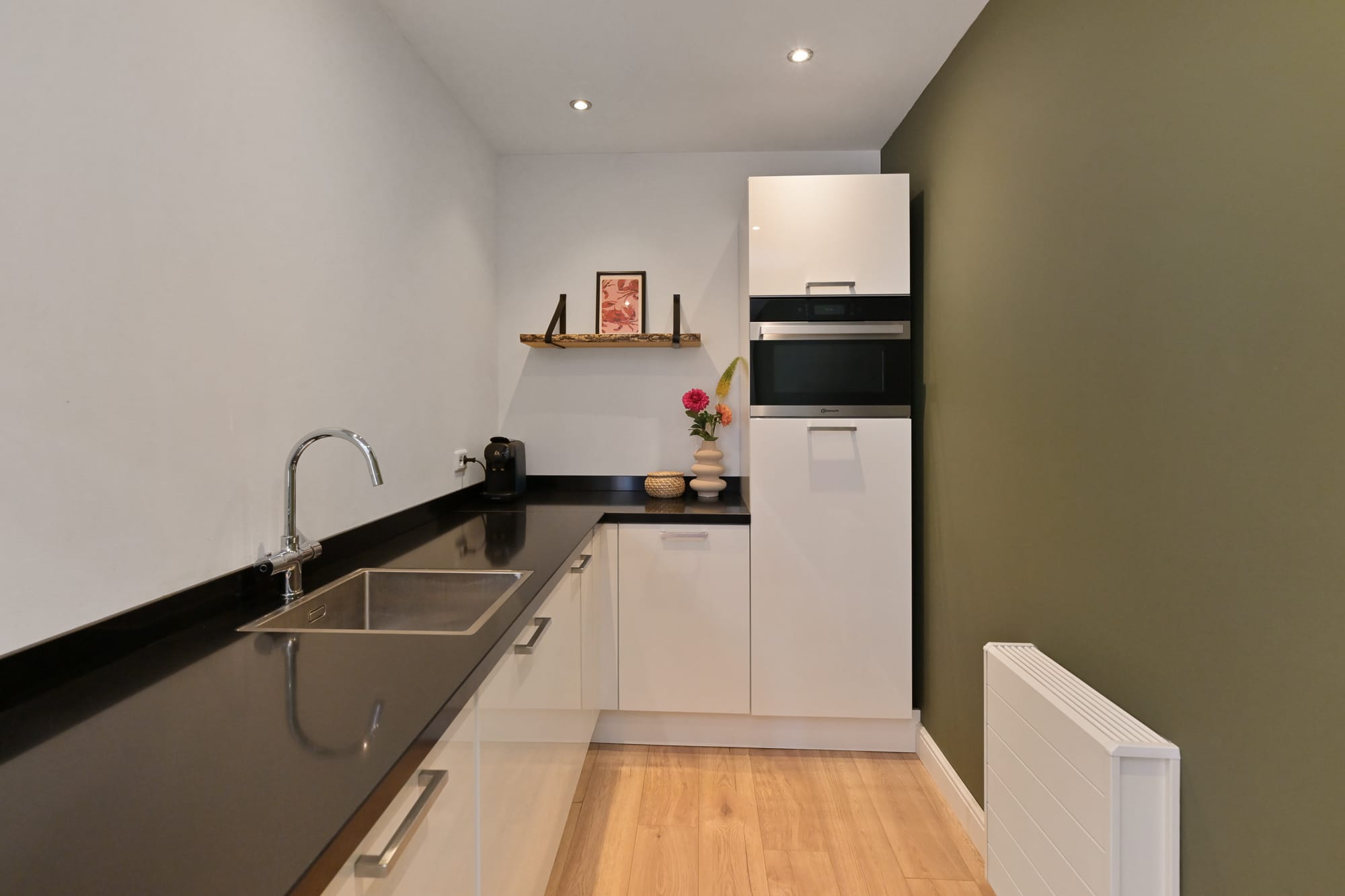 The large living room is located at the front of the house and you enter it at the end of the hall. Upon entering, the space and tranquility are palpable, as the sunlight greets you. The living room is very neatly finished and ready to move in. There is room for a large sitting area and dining table. You can easily receive a large group of friends here! The style of the living room flows into the open kitchen. This is equipped with an extractor hood, sink with mixer tap, dishwasher and a 5-burner gas stove with wok burner.