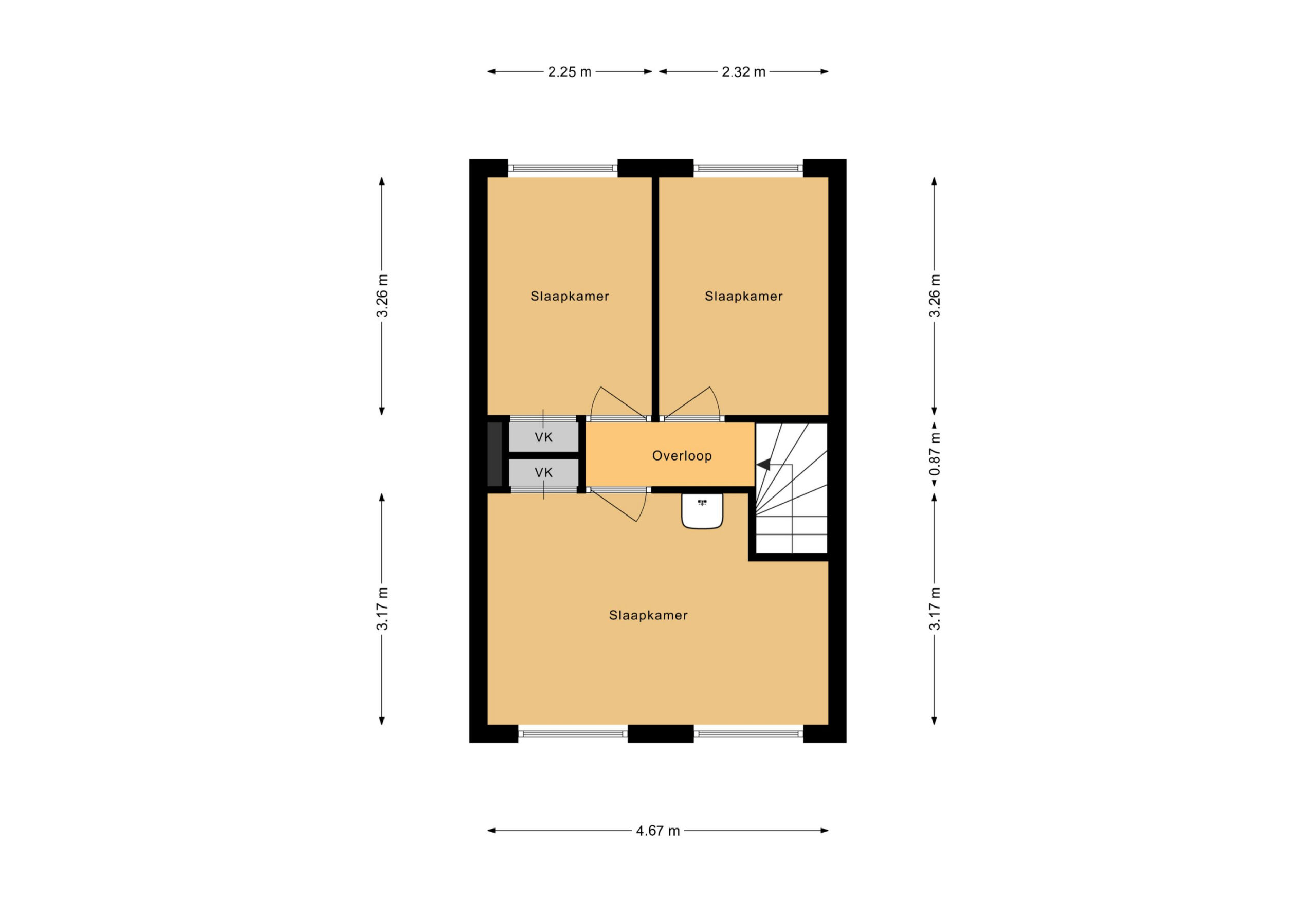 Op de eerste verdieping bevinden zich 3 slaapkamers. De ruime master bedroom is voorzien van wastafel. De kamer is ruim en licht en biedt voldoende ruimte voor een twee persoonsbed en grote kast. Ook hier bevind zich hier een handige voorraadkast. De twee slaapkamers aan de andere zijde zijn licht en ideaal in te richten als extra slaapkamer, hobby- of werkkamer.