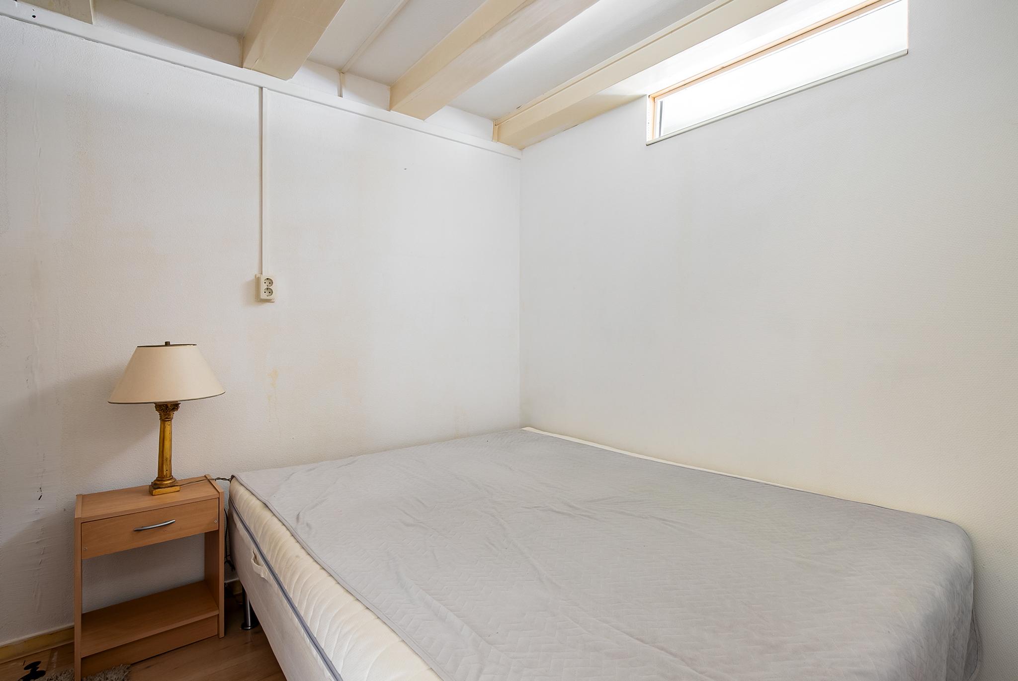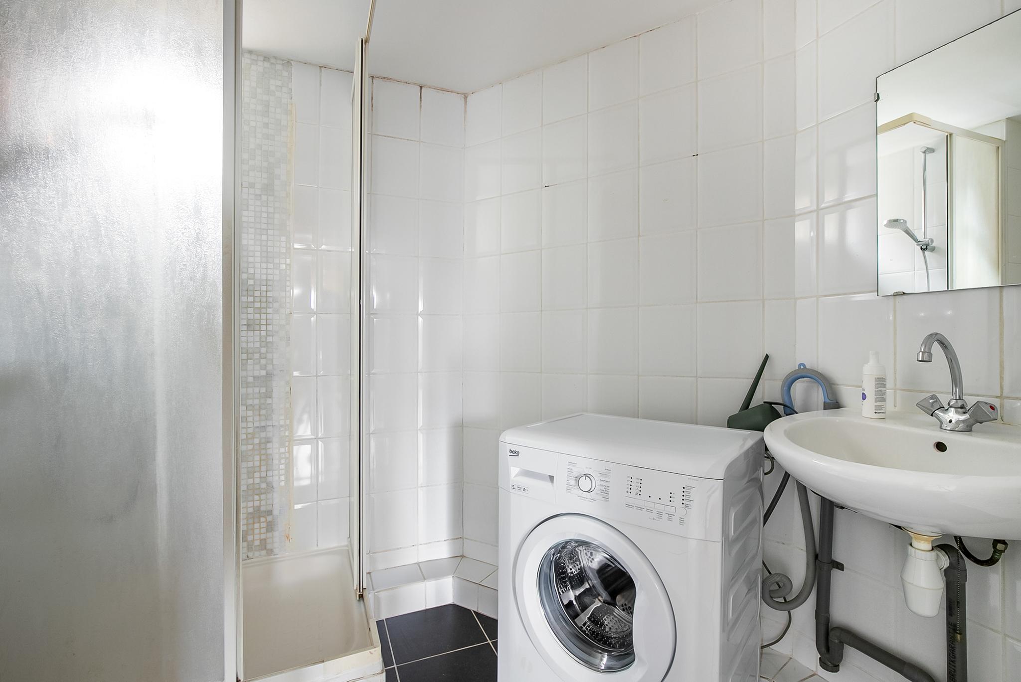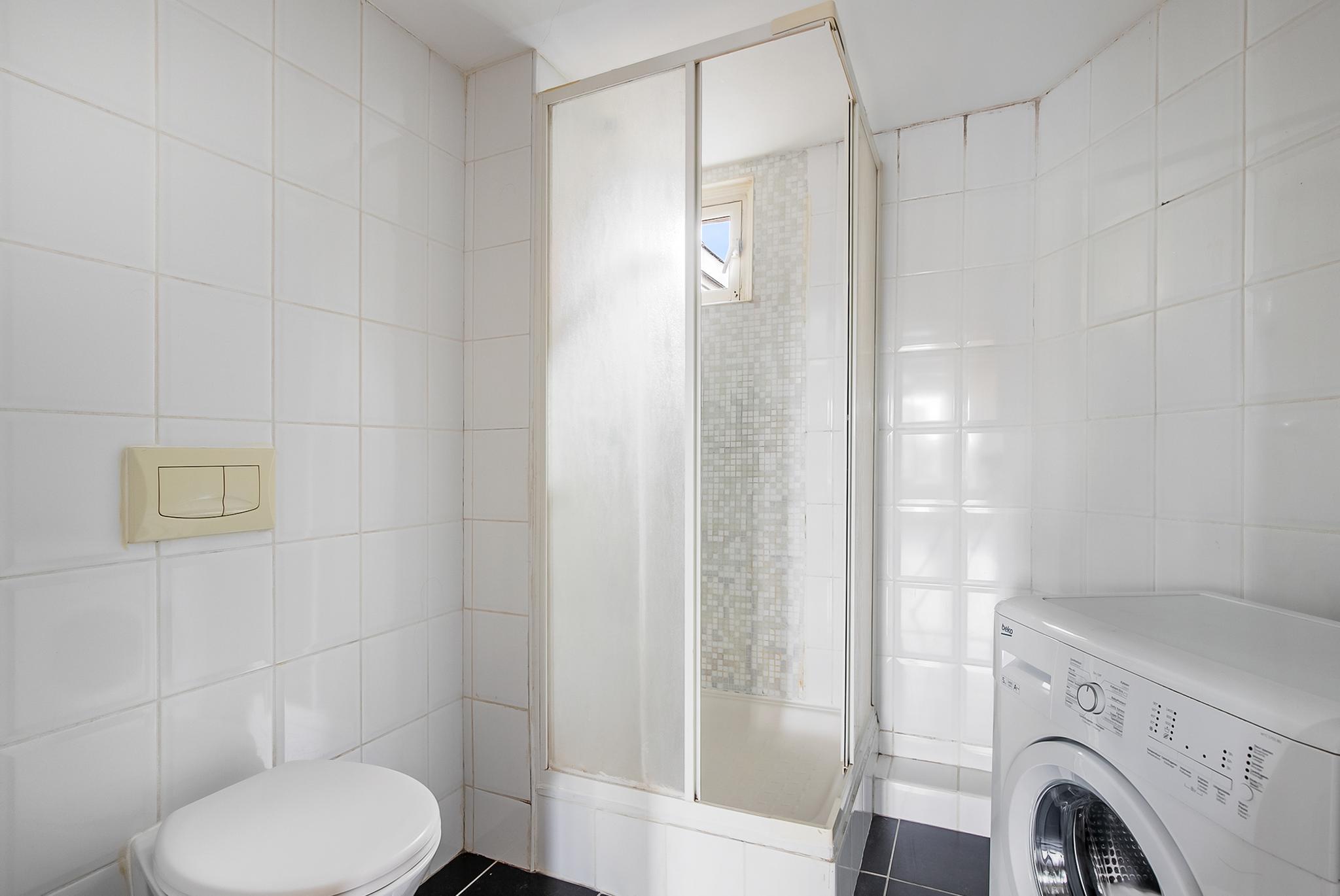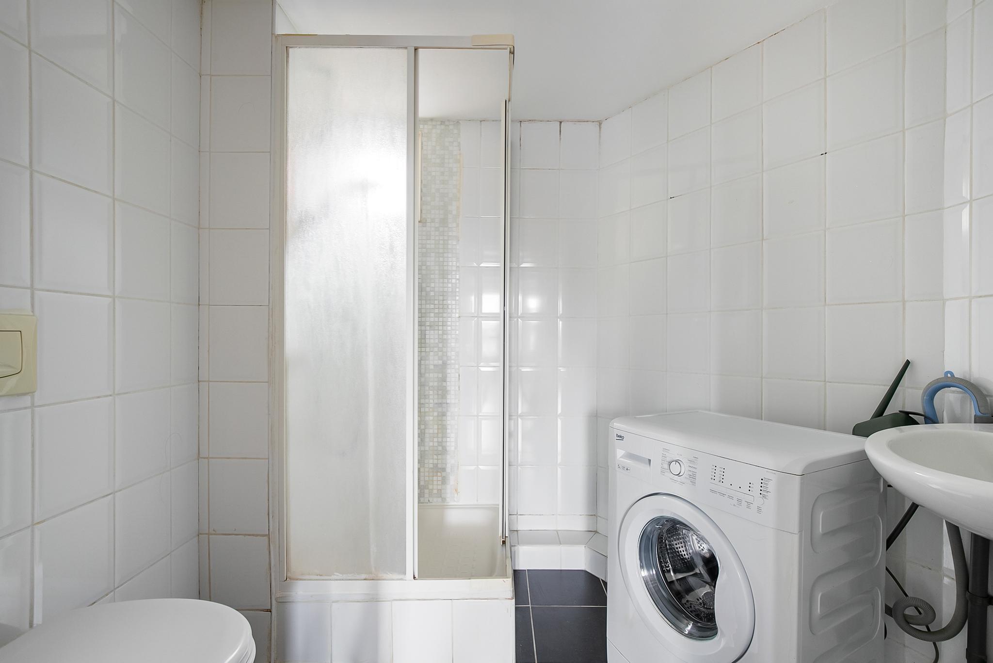 The open kitchen is equipped with light kitchen furniture and various built-in appliances such as a refrigerator and freezer and gas hob with extractor hood. The bedroom has a light finish and also has a beamed ceiling and a window. This ensures pleasant light and a peaceful atmosphere. The bathroom has a light wall tile combined with a dark floor tile, and is equipped with a shower, sink, hanging toilet and white goods connection.