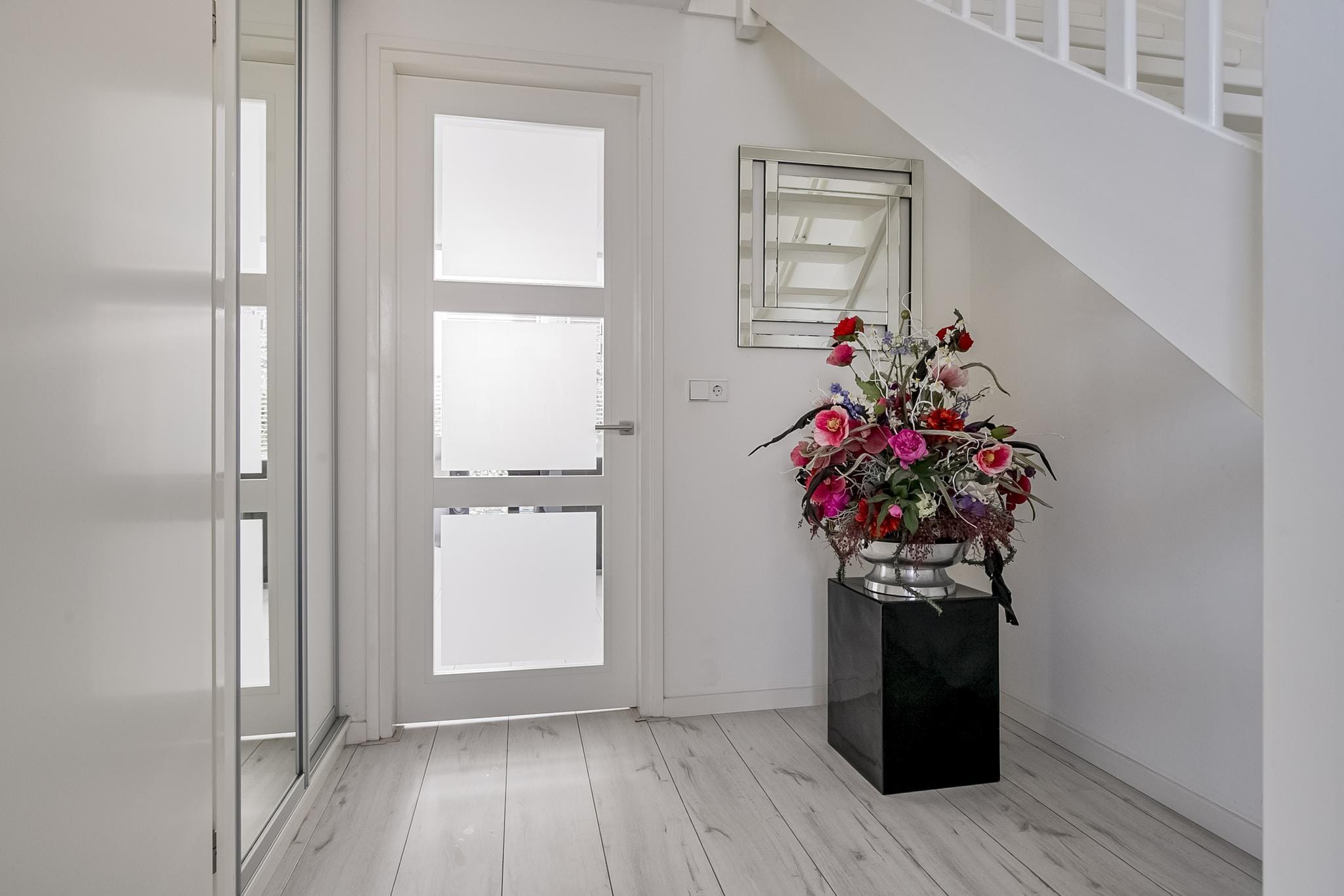 Upon arrival you enter the house through the well-maintained front garden with private driveway. Under the roof there is a cozy terrace, ideal for relaxing. Upon entering the spacious lobby you are welcomed by a bright and inviting space that provides access to the toilet room, the stairs to the first floor and the passage to the living room. This hall offers enough space to place a coat rack or stylish storage furniture, so that you can neatly store your things.