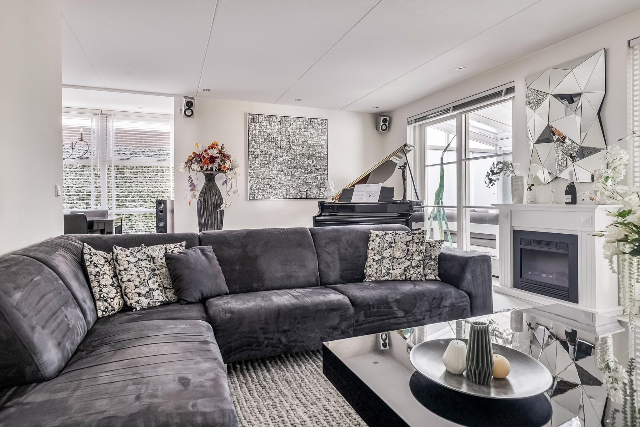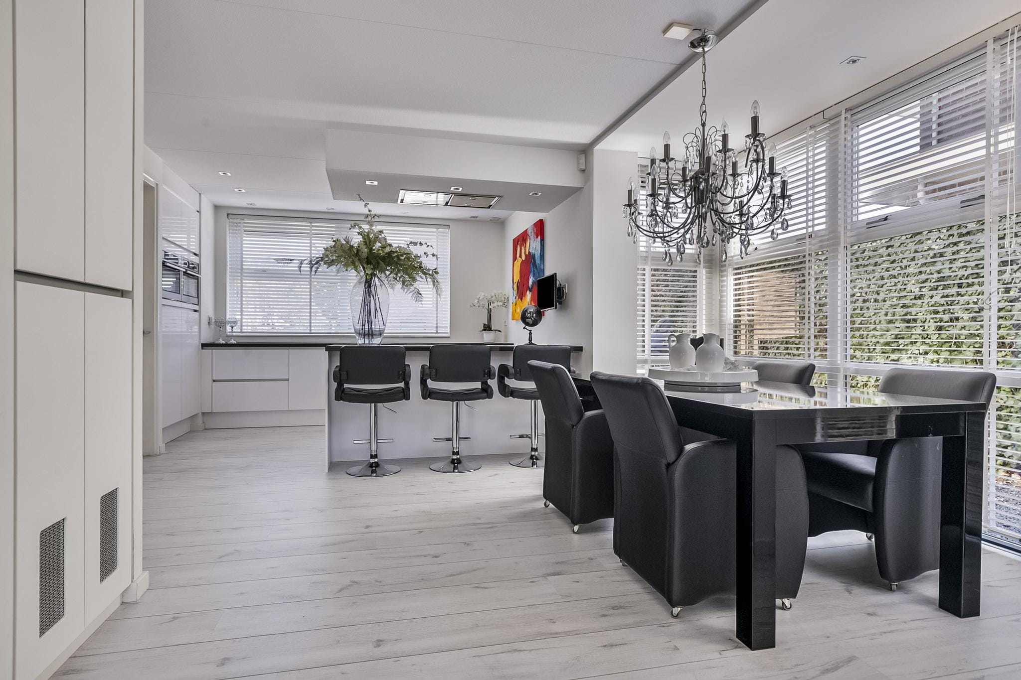 Vanuit de hal betreedt u de woonkamer, het stralende middelpunt van de begane grond. De grote raampartijen zorgen voor een overvloed aan natuurlijk daglicht en creëren een uitnodigende sfeer. De ruimte biedt volop mogelijkheden voor het inrichten van zowel een gezellige zithoek bij de haard als een royale eethoek. De open indeling maakt het eenvoudig om de kamer naar wens in te richten.