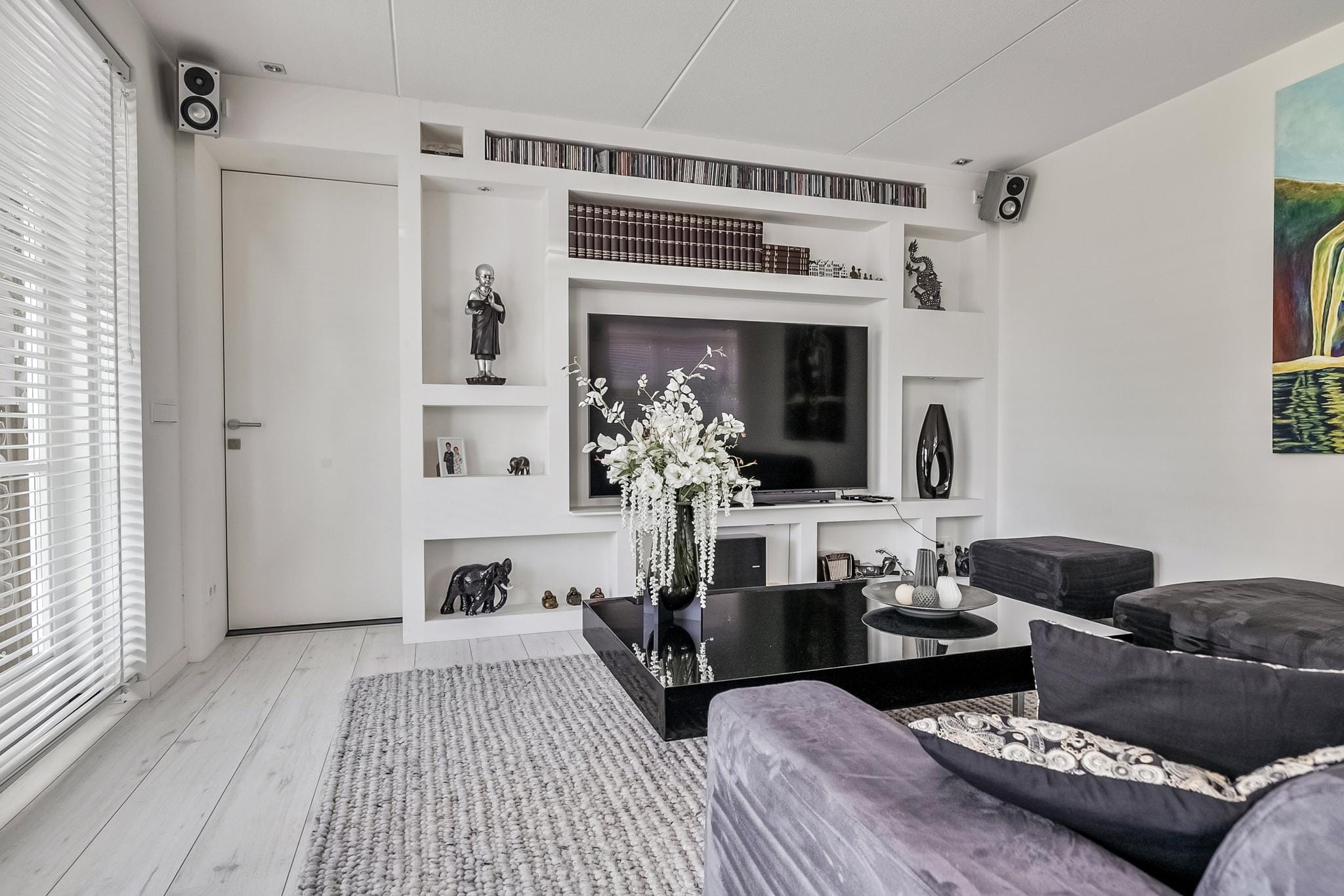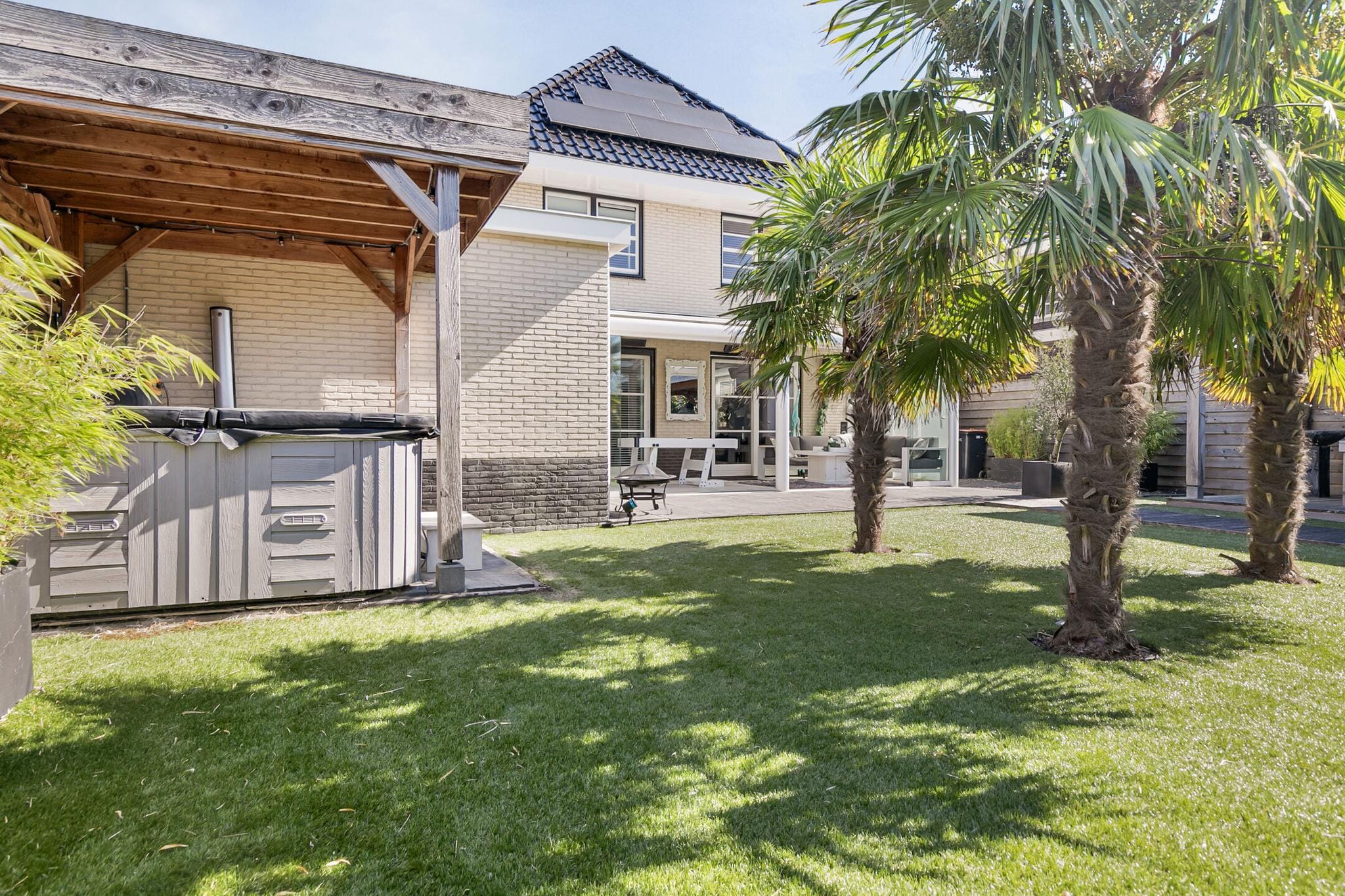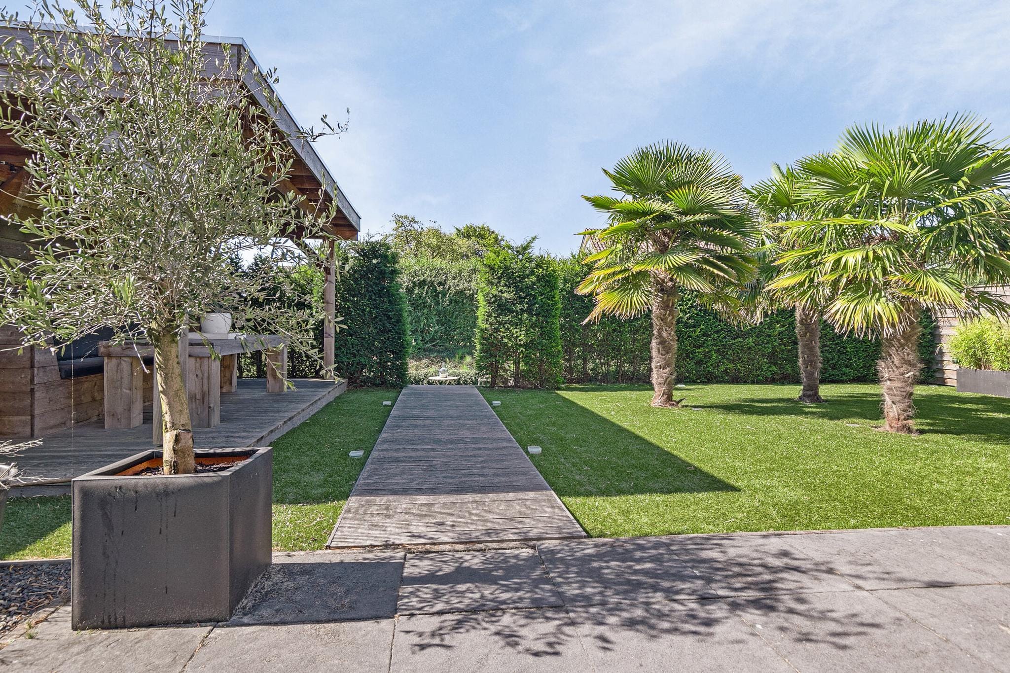 From the living room you can step straight into the green and sunny backyard, where a covered terrace awaits you. This spot is ideal for placing a lounge set or an outdoor table, so that you can optimally enjoy the sun. The awning provides extra shade on hot days. Multiple canopies create cozy corners to relax and at the rear the garden borders the water with a deck, which is a unique and relaxing addition.