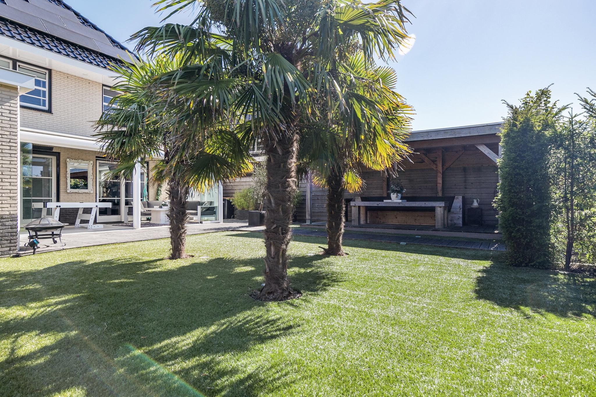 Vanuit de woonkamer stapt u zo de groene en zonnige achtertuin in, waar een overdekt terras op u wacht. Deze plek is ideaal voor het plaatsen van een loungeset of een buitentafel, zodat u optimaal van de zon kunt genieten. Het zonnescherm biedt extra schaduw op warme dagen. Meerdere overkappingen creëren gezellige hoekjes om te ontspannen en aan de achterzijde grenst de tuin aan het water met een vlonder, wat een unieke en rustgevende toevoeging is.