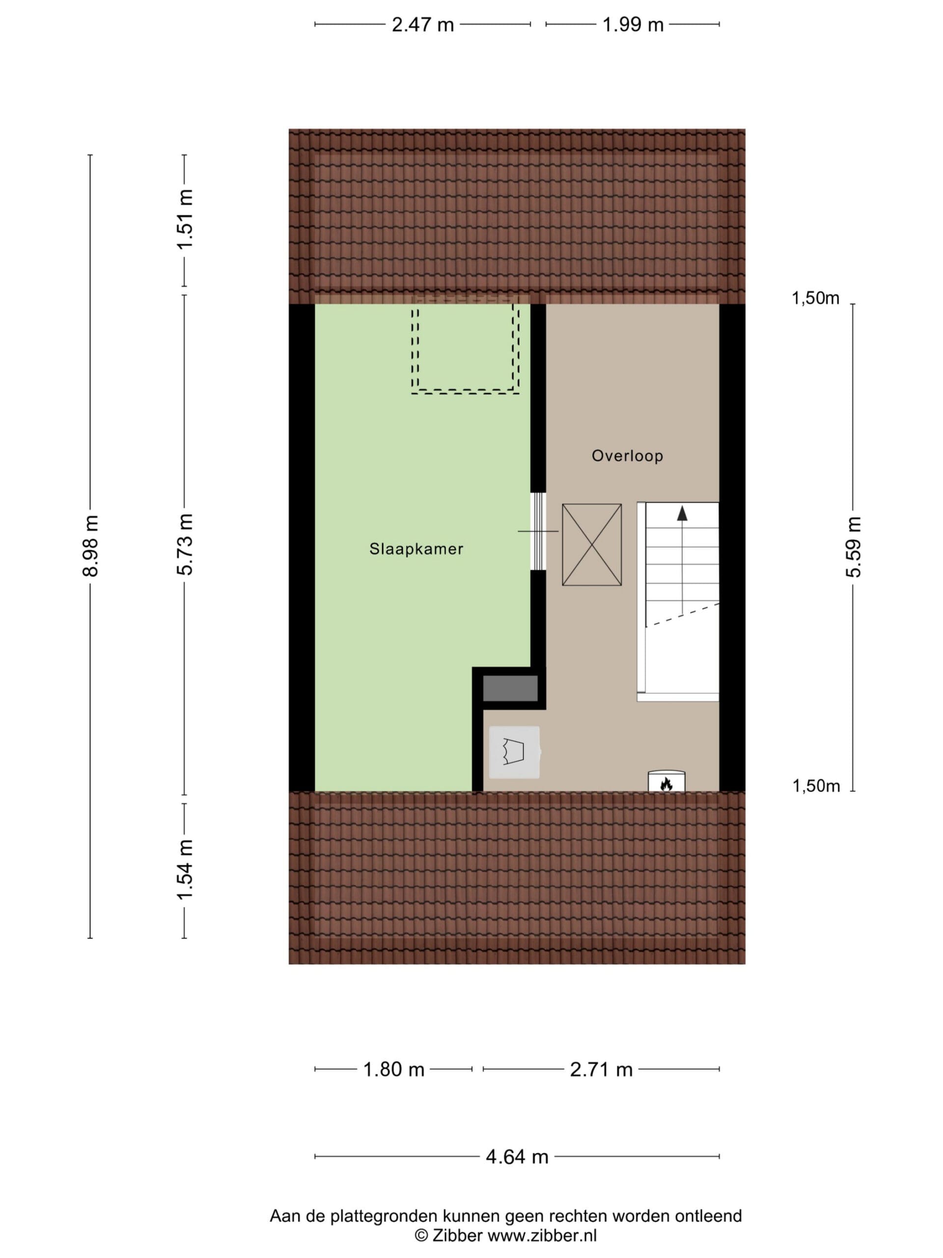 Here, you’ll find a very spacious landing with the laundry room and central heating boiler. The central heating was replaced in August 2025. There is also a staircase leading to the spacious attic. The bedroom spans the entire length of the house and could easily be divided into two bedrooms.