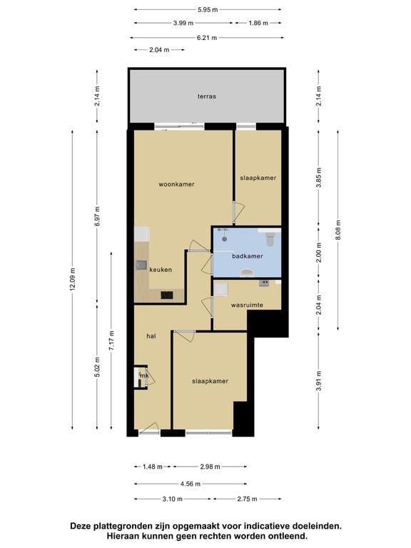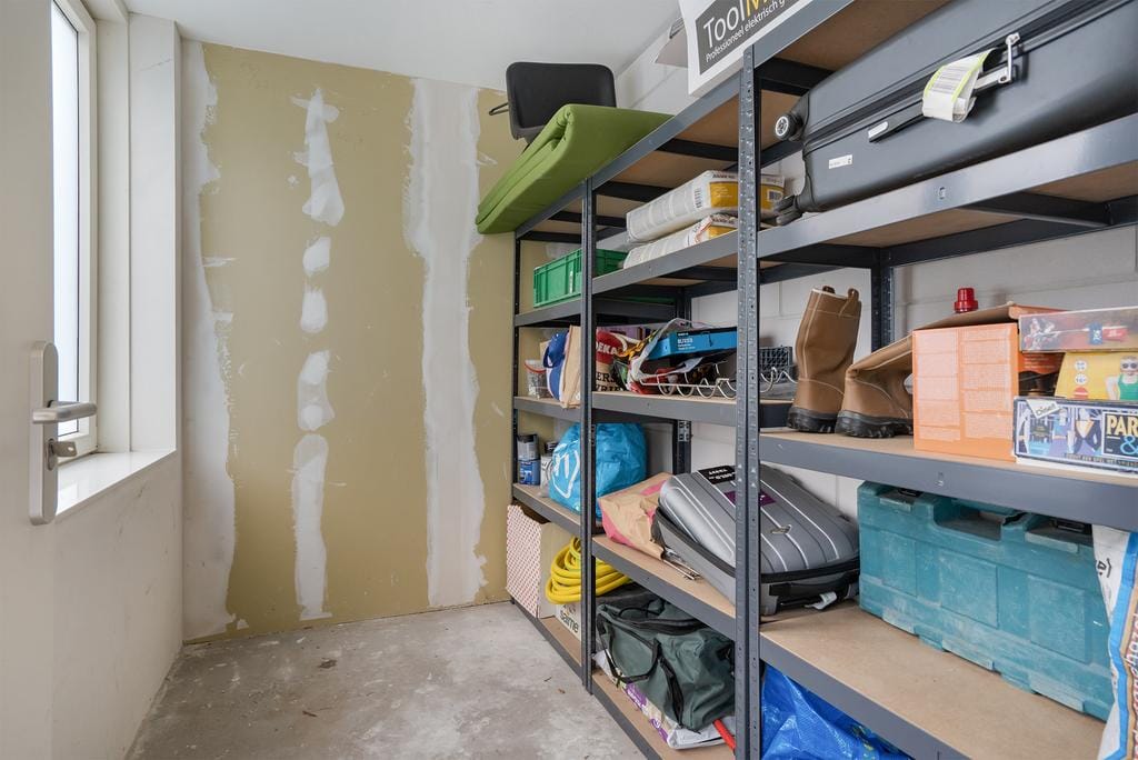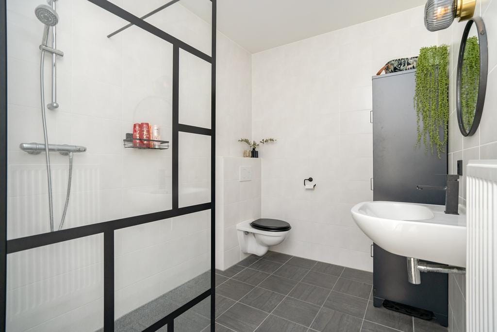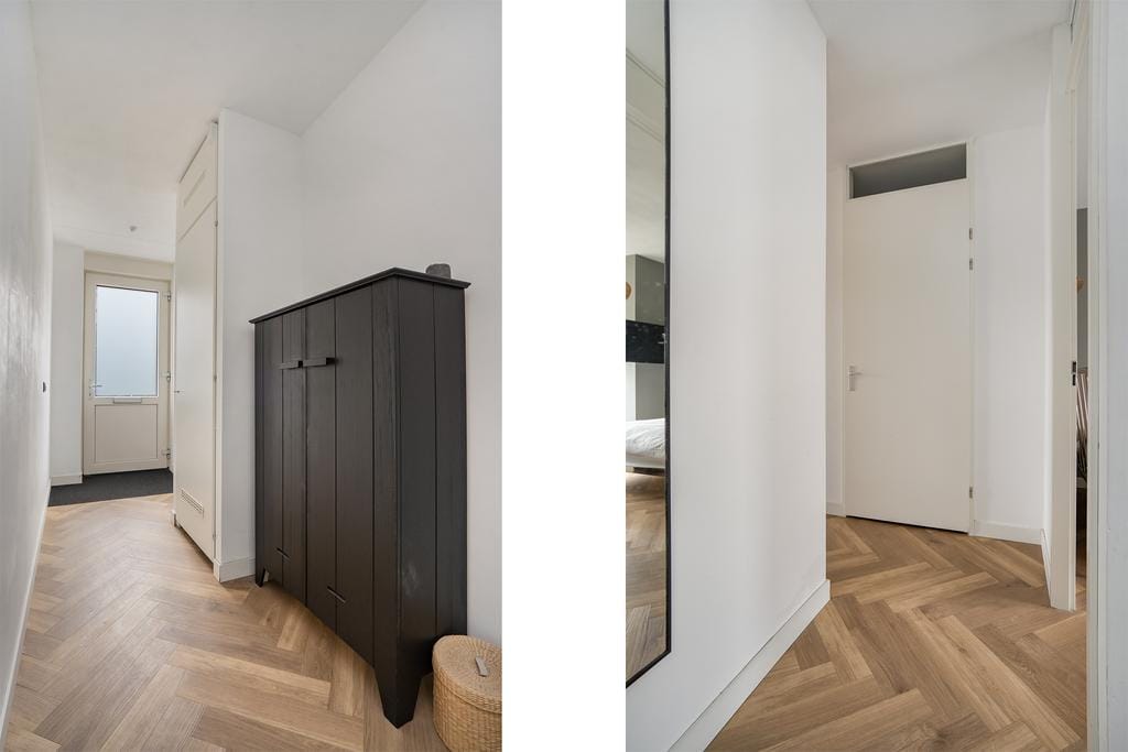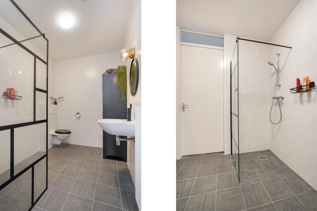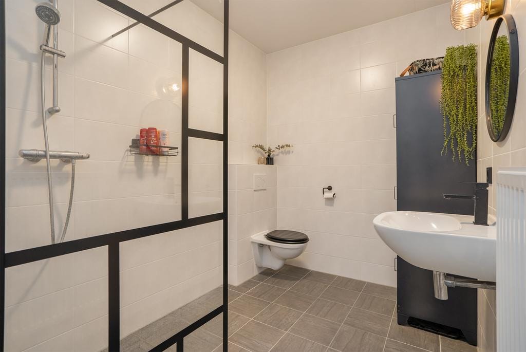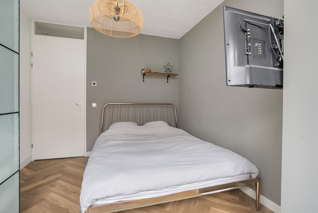 Vanuit de voortuin lopen we naar de toegangsdeur. Binnen treffen we in de hal eerst de meterkast gevolgd door een ruime slaapkamer, gelegen aan de voorzijde van dit kleinschalige appartementencomplex. Naast het goede formaat van de slaapkamer heeft deze veel natuurlijk lichtinval. Na de eerste slaapkamer geeft de hal toegang tot een berging en wasruimte. Daarnaast gelegen is de badkamer. De badkamer is strak afgewerkt met neutrale kleuren en heeft een ruime inloopdouche, toilet en wasbak. Na de badkamer komen we uit in mooi afgewerkte woonkamer met pvc visgraat vloer én uitzicht over het water!