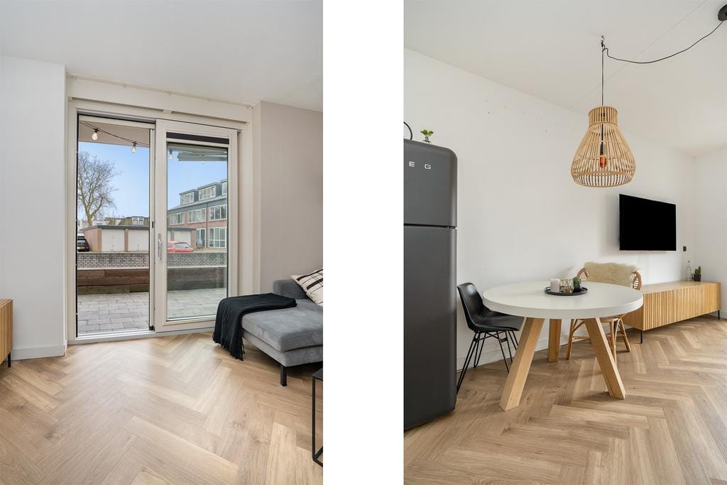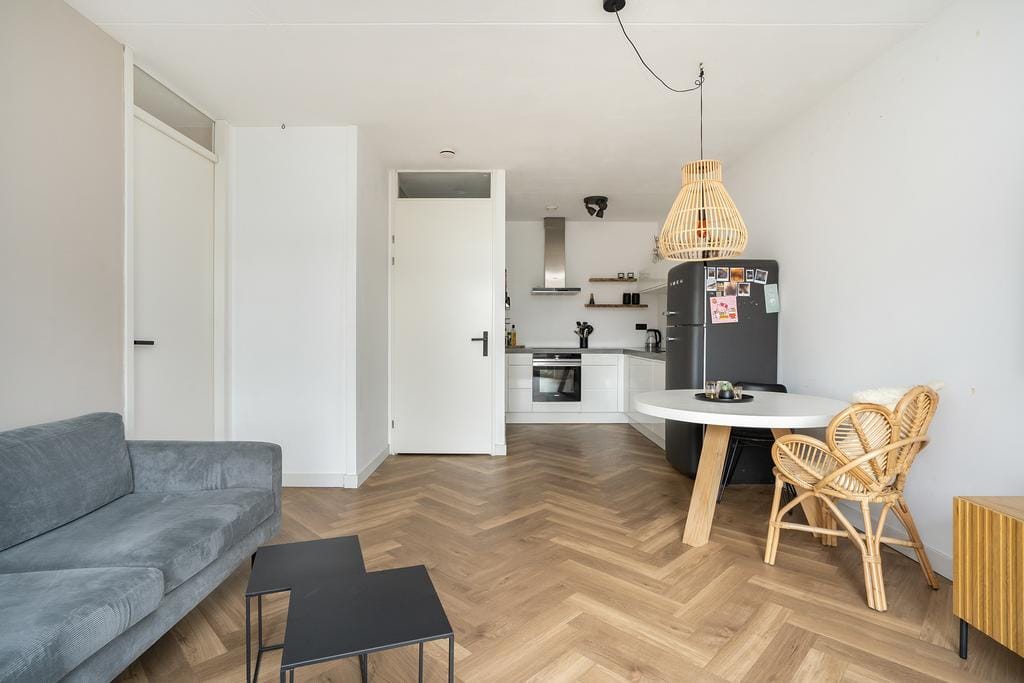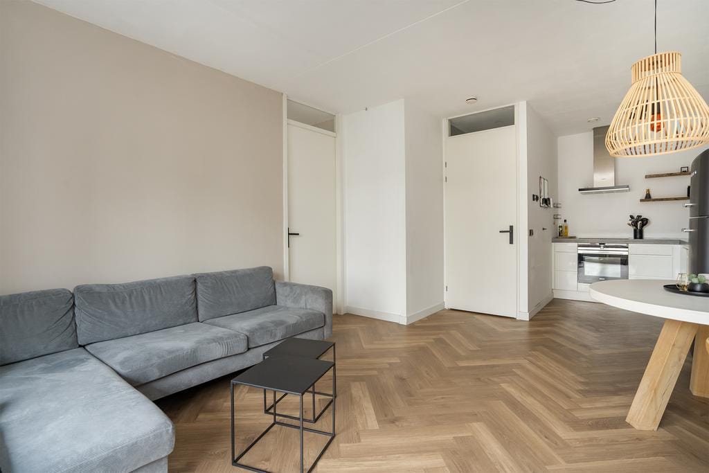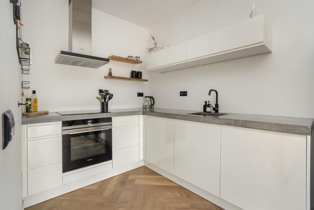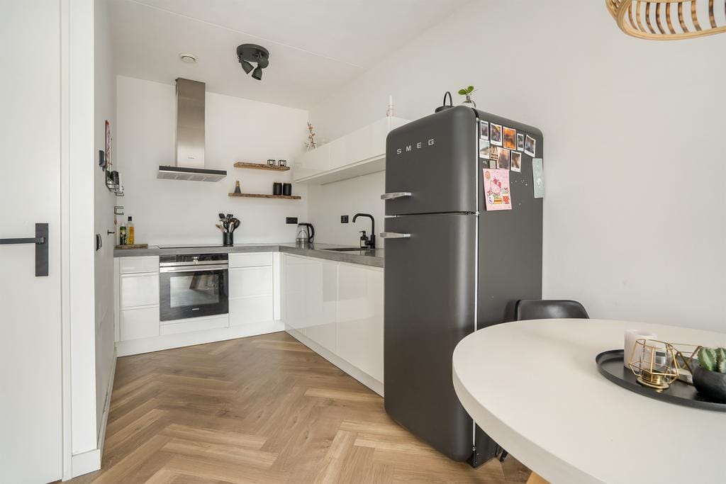 De L-vormige lichte woonkamer met open keuken is praktisch ingedeeld. De moderne open keuken is van alle gemakken voorzien: inductiekookplaat, vaatwasser, combi-oven, spoelbak met zwarte kraan en een SMEG koelkast. De keuken is afgewerkt met een lichtgrijs stenen aanrecht. Aan de woonkamer grenst tevens een tweede slaapkamer. Deze slaapkamer is ook geschikt als thuiswerkplek, logeerkamer of baby/kinderkamer.