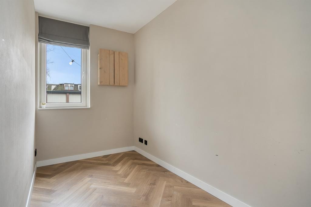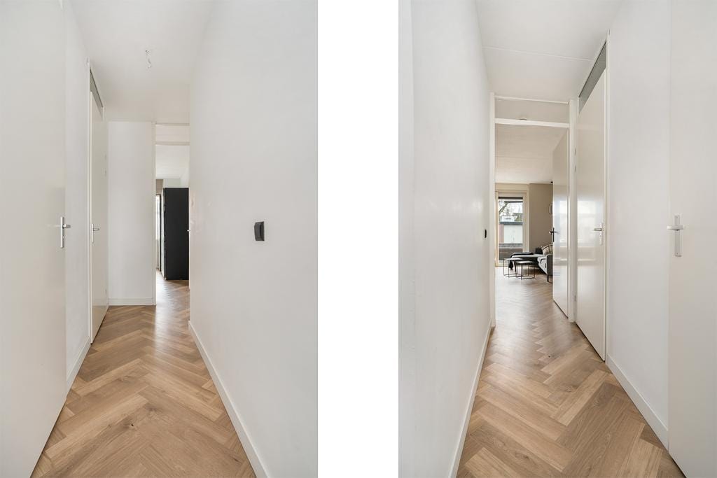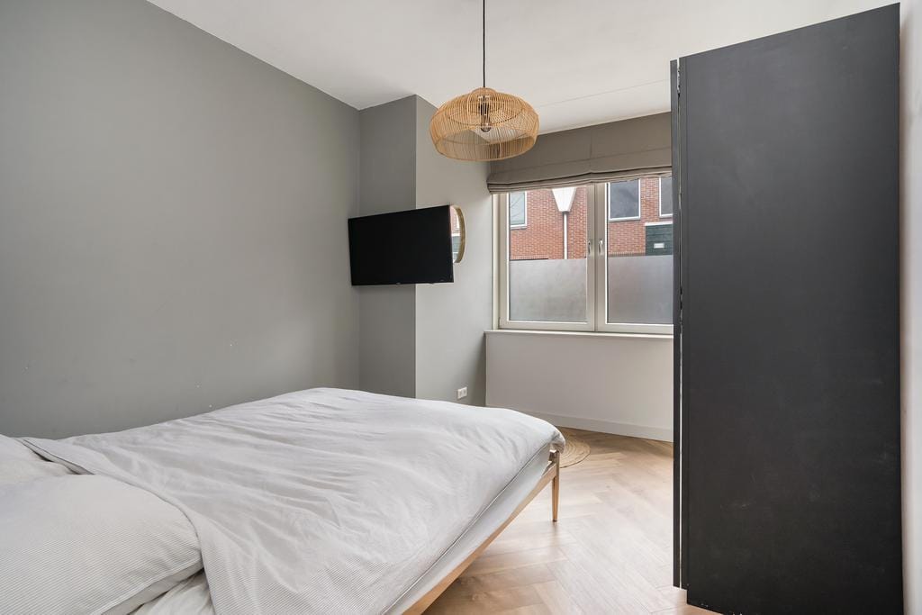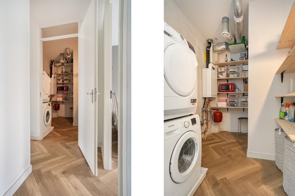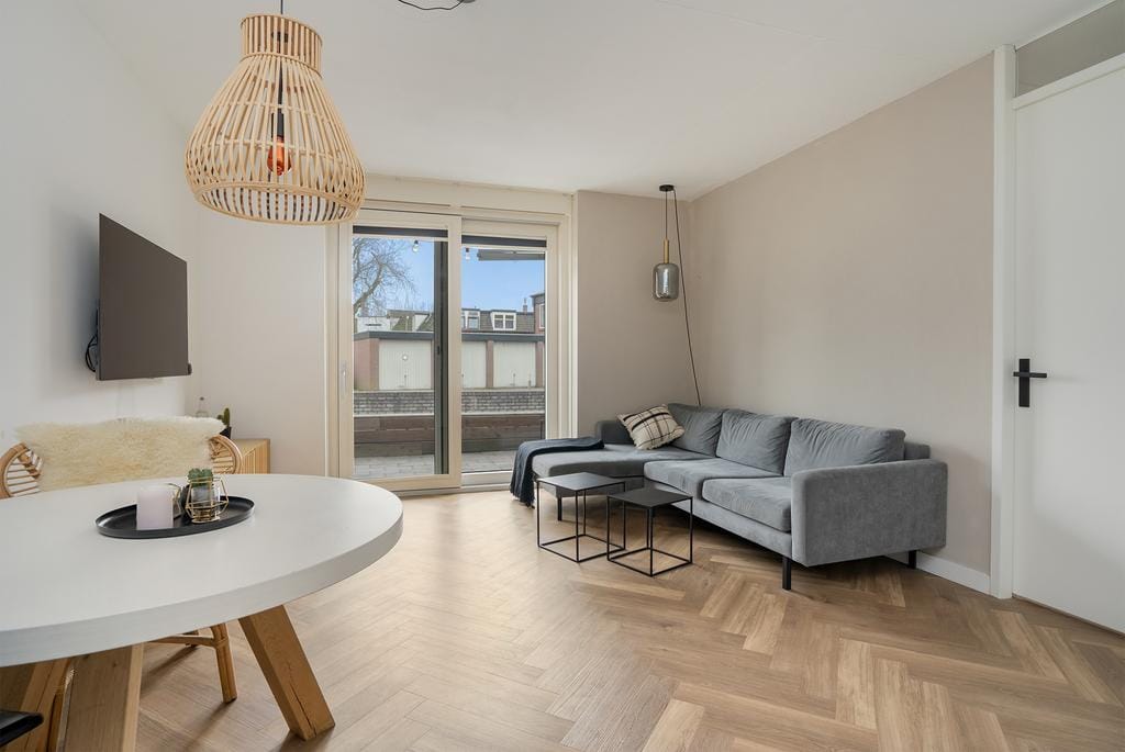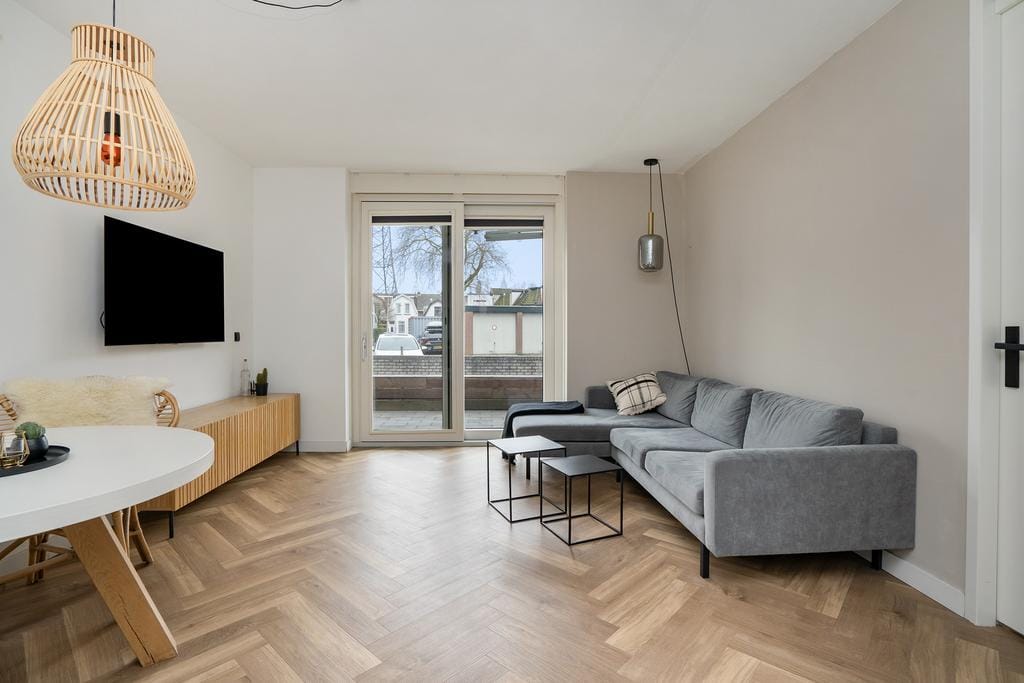 De L-vormige lichte woonkamer met open keuken is praktisch ingedeeld. De moderne open keuken is van alle gemakken voorzien: inductiekookplaat, vaatwasser, combi-oven, spoelbak met zwarte kraan en een SMEG koelkast. De keuken is afgewerkt met een lichtgrijs stenen aanrecht. Aan de woonkamer grenst tevens een tweede slaapkamer. Deze slaapkamer is ook geschikt als thuiswerkplek, logeerkamer of baby/kinderkamer.